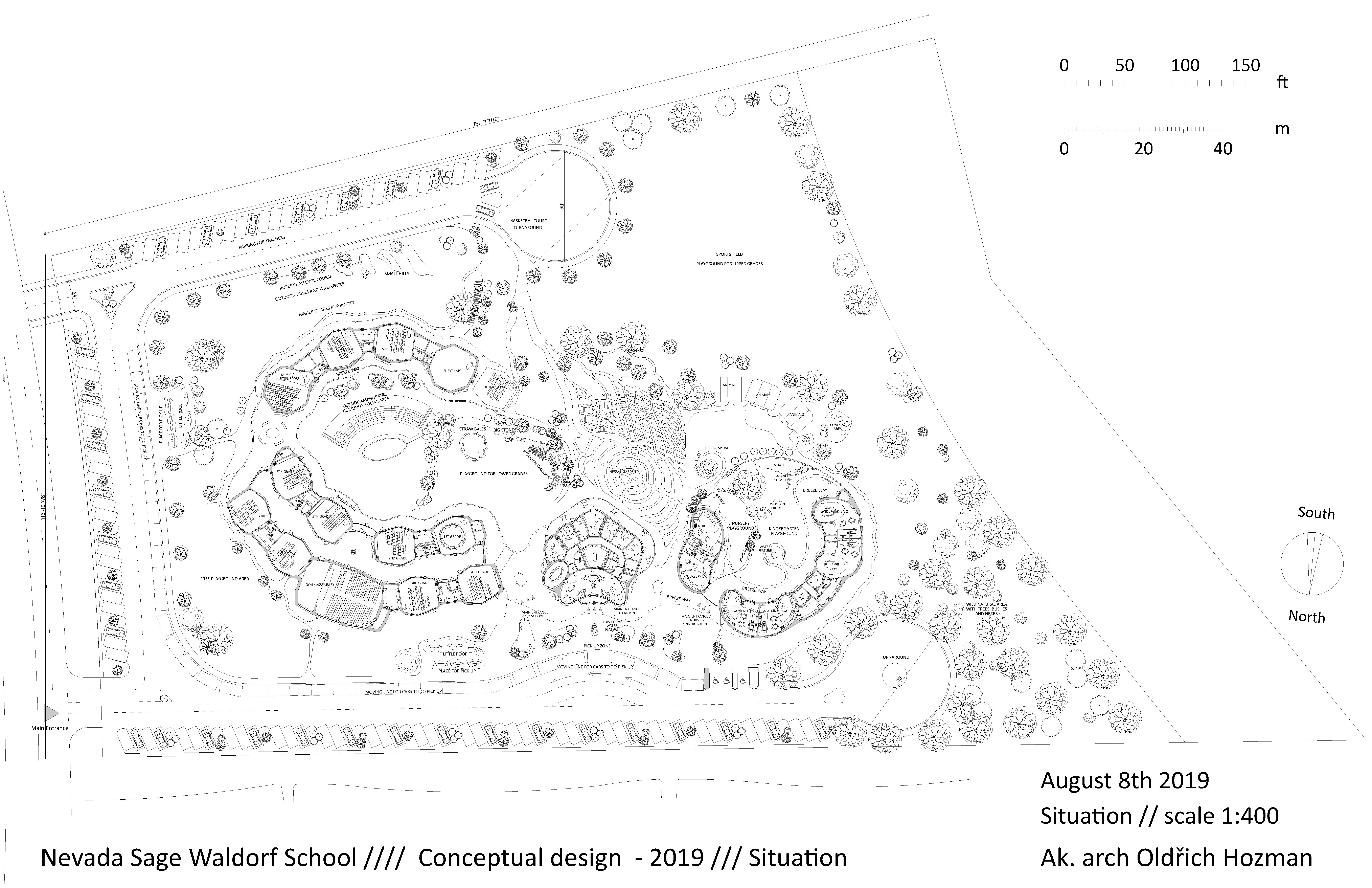 Diseño arquitectónico para una escuela Waldorf y un jardín de infancia en Reno, Nevada. El estudio se desarrolló de forma participativa en estrecha colaboración con los profesores de la escuela. Es una preparación para el diseño detallado del campus. Como parte del estudio de todo el emplazamiento, el personal de la escuela verificó el alcance del proyecto y confirmó las instrucciones para la siguiente fase del proyecto. El objetivo es implantar un campus ecológico con elementos orgánicos de arquitectura sostenible adecuados a las condiciones climáticas de Nevada. La fuerte luz solar directa del verano y los periodos más cortos de nieve en invierno contribuyen a dar sombra a los edificios propuestos, por ejemplo los pasajes techados y los voladizos de los tejados a lo largo de los edificios. Los tejados verdes de asta de ciervo también ayudan a mantener una temperatura interior agradable. El carácter de la disposición general y la morfología de los edificios apoyan los principios de la pedagogía Waldorf. Encontrará una descripción más detallada de la creación y los detalles del estudio en los pies de foto de las figuras. Las imágenes están dispuestas como una historia que retrocede desde el estudio finalizado hasta su comienzo.