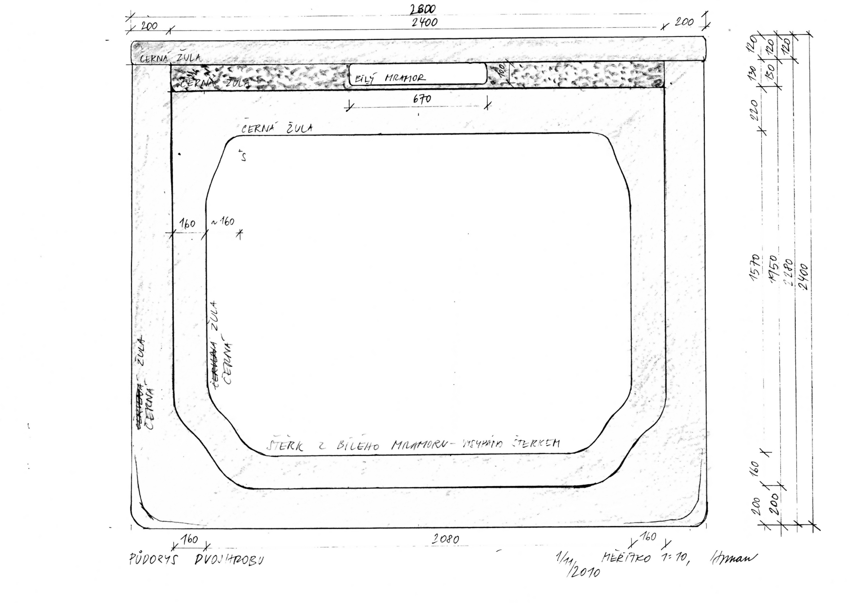 La tumba, de dos tumbas de ancho, está hecha en su mayor parte de granito. En el centro hay mármol blanco triturado. La lápida es de granito negro combinado con mármol blanco. El objetivo era crear una tumba de formas suaves y redondeadas.