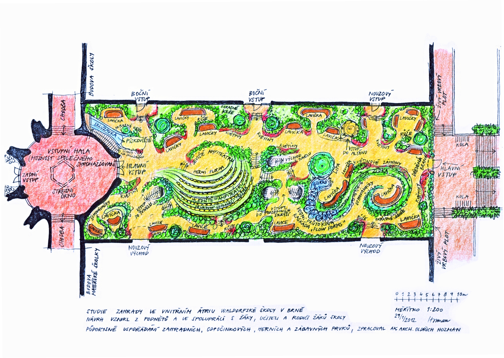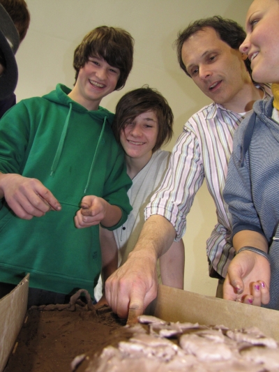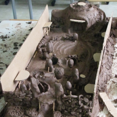 La necesidad de una nueva entrada a la escuela y el acondicionamiento del jardín dieron lugar a un proyecto conjunto de alumnos, profesores y padres. El diseño se creó colectivamente en un modelo escultórico de arcilla. Esto creó un ambiente animado lleno de ideas y creatividad.