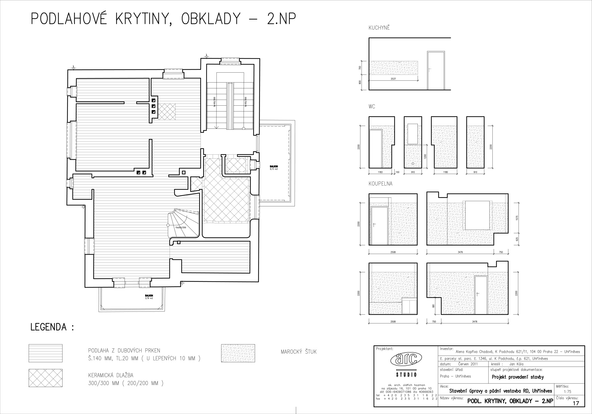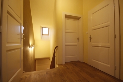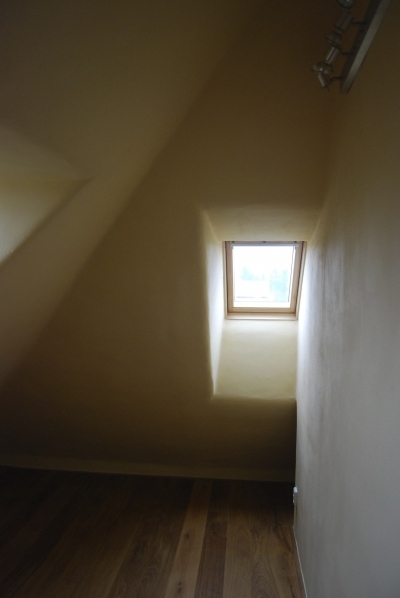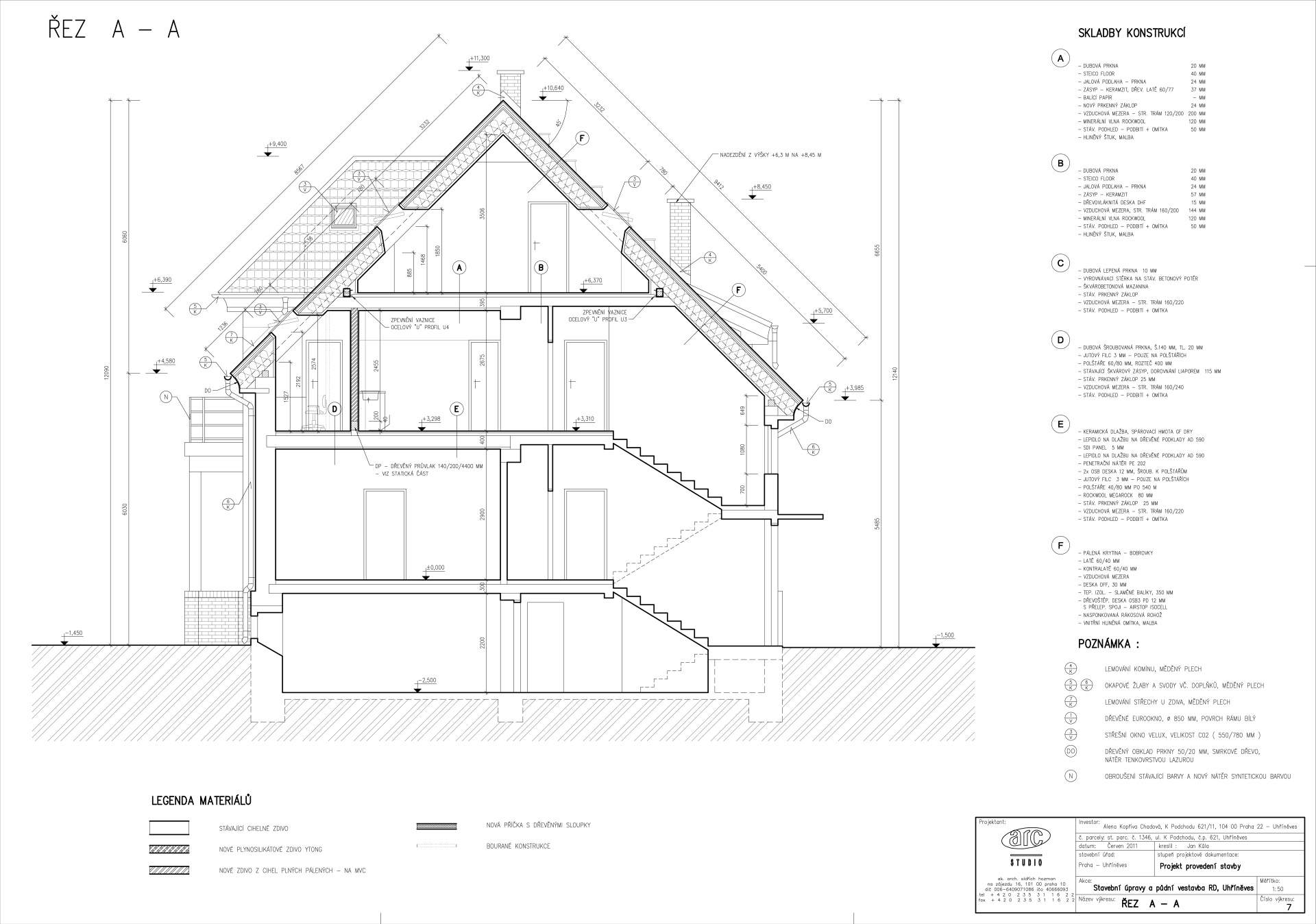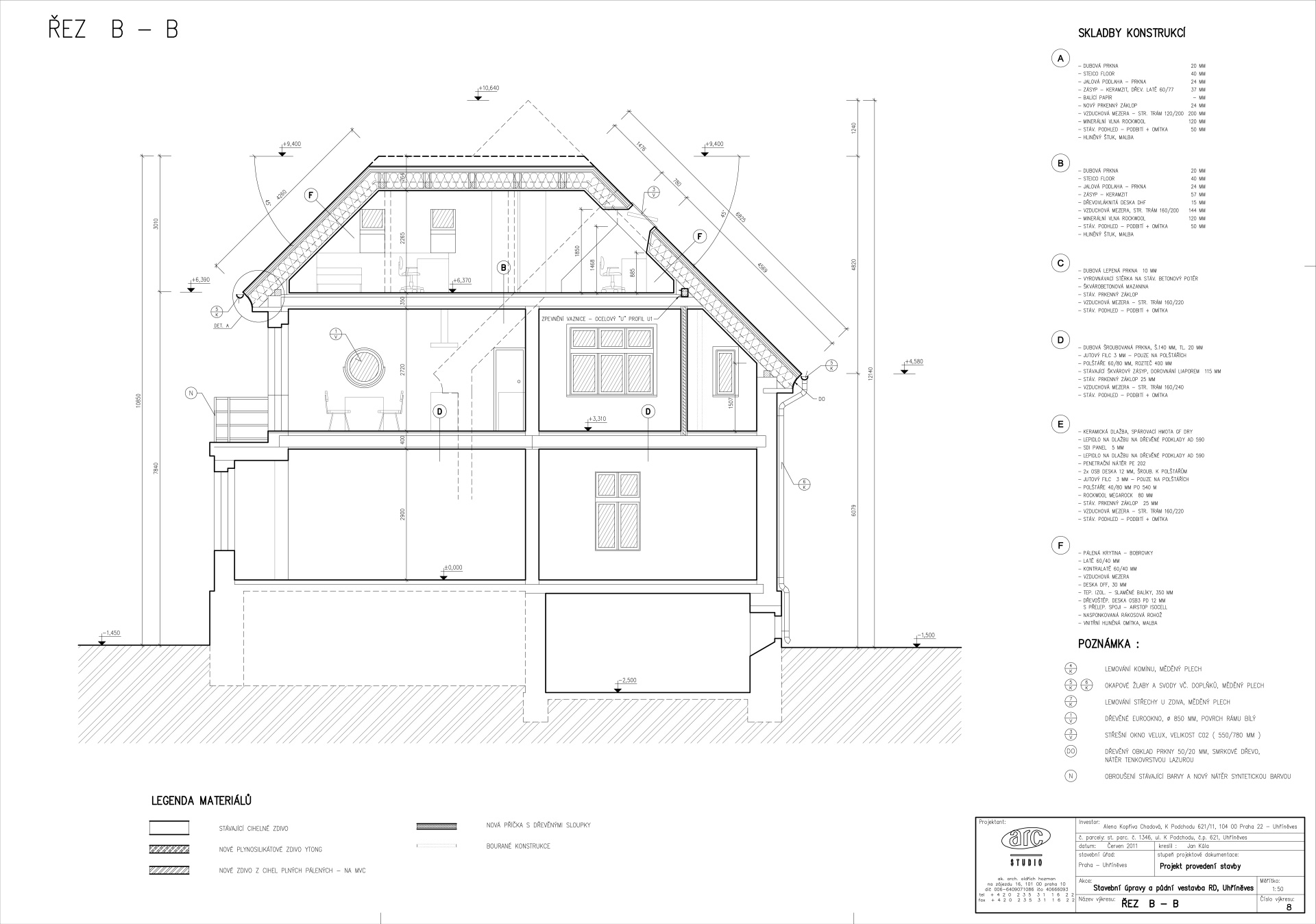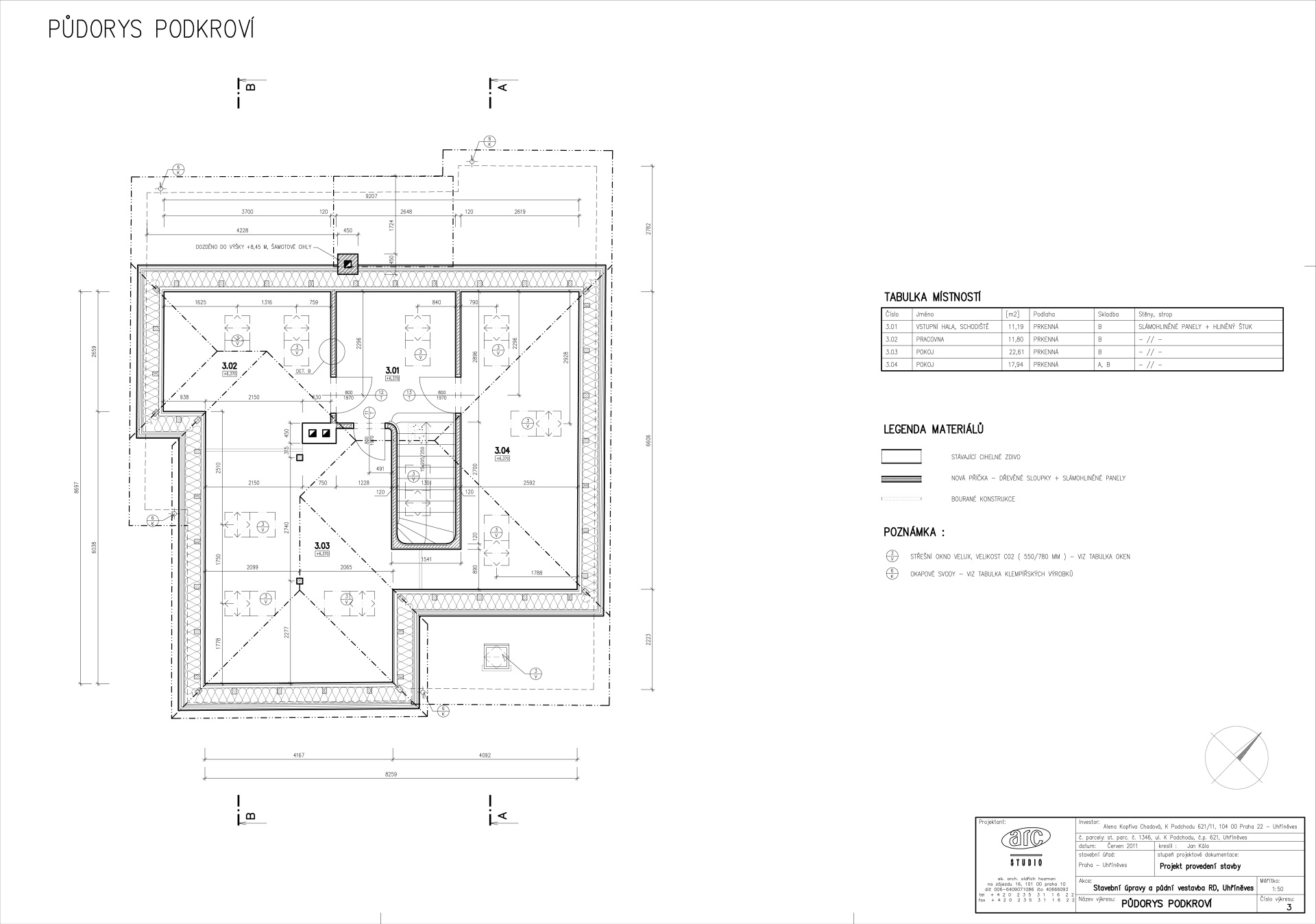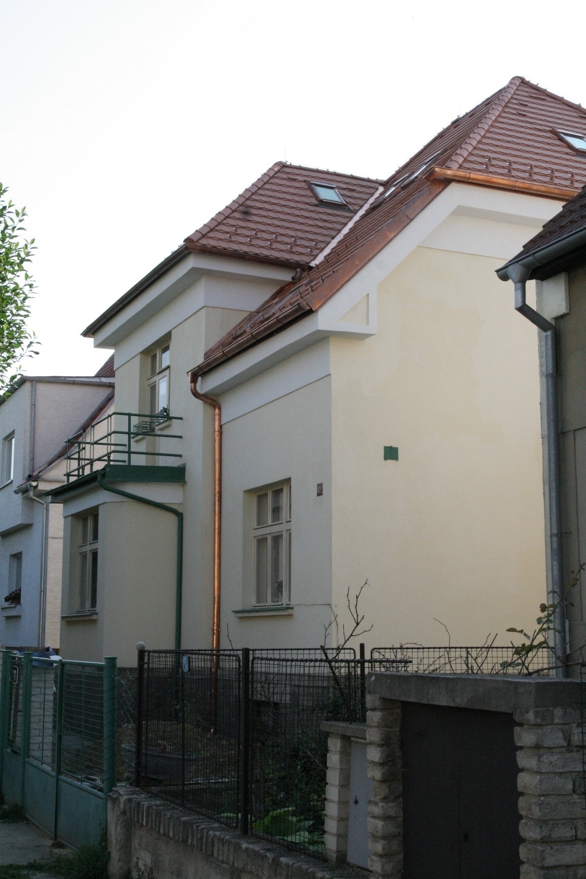 Proyecto de reconstrucción del primer piso y ático de una casa unifamiliar en Uhříněvsi, Praga 10. El edificio está construido con materiales de construcción naturales de bajo consumo energético. El revestimiento del tejado está aislado con balas de paja de cereal comprimida. Los interiores tienen yeso de arcilla y los cuartos de baño estuco marroquí.