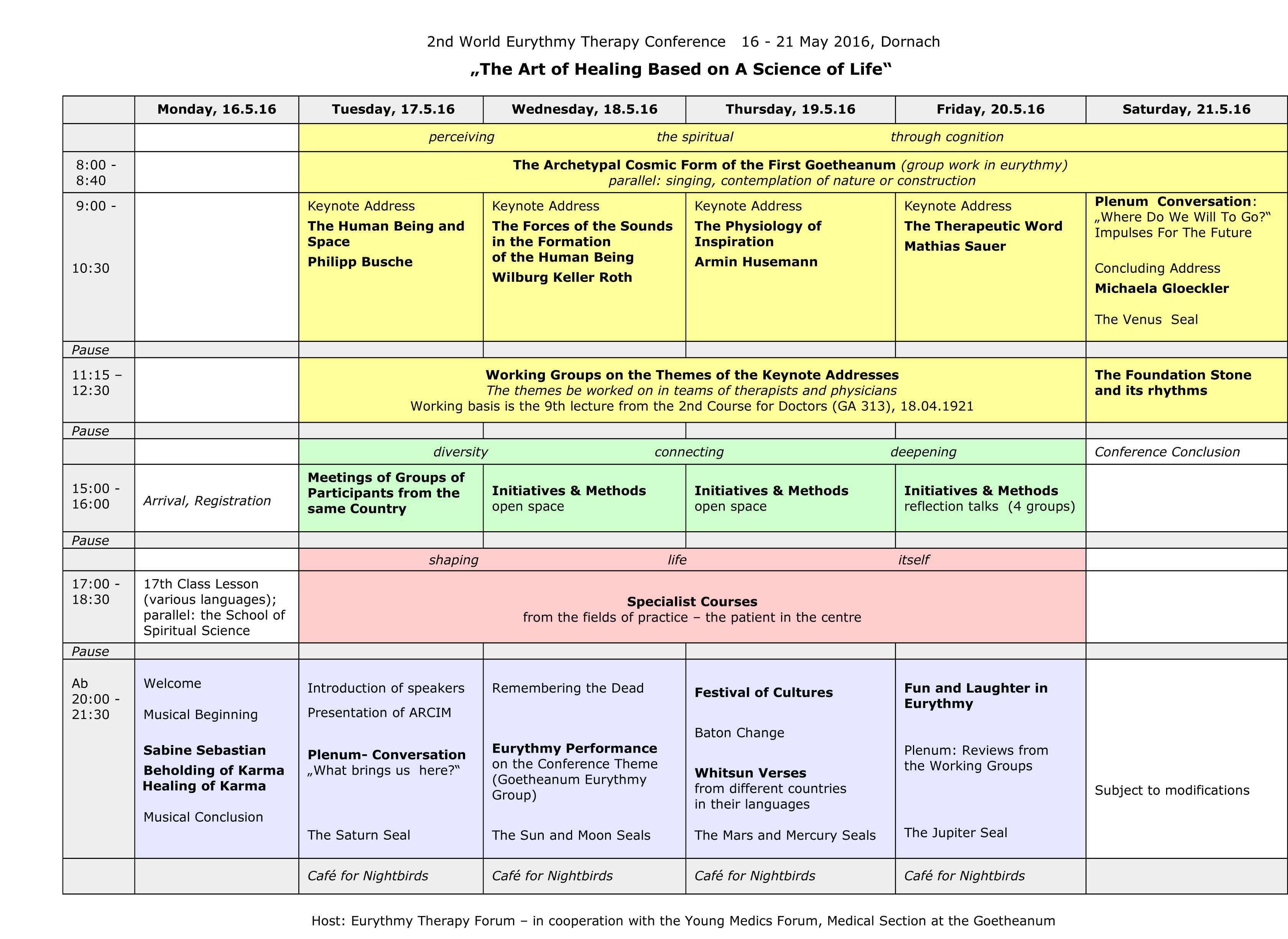 Místo konání konference: Goetheanum, Rüttiweg 45, CH-4143 Dornach, Švýcarsko. Pořadatel: International Healing Eurythmy MovementMEDICAL SECTION AT THE GOETHEANUM (The Medical Section is one of 11 specialist sections of the School of Spiritual Science at the Goetheanum in Dornach/Switzerland. V České republice pořádá kurzy léčebné a umělecké eurytmie Eurythmea o.s.