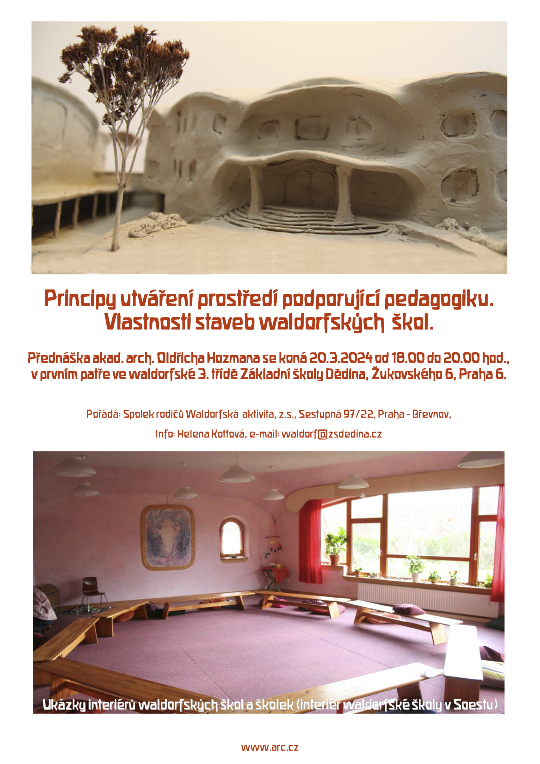 Proto bych vás rád v sérii seminářů, přednášek a workshopů seznámil s vlastnostmi architektury a prostředí, které výchově ve waldorfských školách pomáhají. Jeden ze základních kamenů výchovy ve waldorfských školách je, aby si žák prožil správné zařazení člověka jako bytosti mezi kvality ducha a země. Jedním z nástrojů prohloubení prožitků je umělecké vyučování a umělecky utvářené stavby a jejich okolí. Jak těmto prožitkům pomáhat při utváření prostředí školy bude obsahem této přednášky. V úvodu si řekneme, jaké lidské úkony mají souvislost s působením duchových sil v záměru stavby. Dále se budu věnovat konkrétním viditelným vlastnostem architektury škol vyjadřujícím vztah k duchu a k vývojovým vlastnostem dítěte. V další části přednášky popíši, jak v architektuře zažíváme to, co vnímáme jako lidské. V závěru bude pojednání o zažívání a působení zemských kvalit a o přírodních stavebních materiálech.