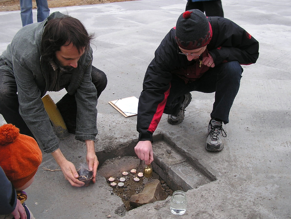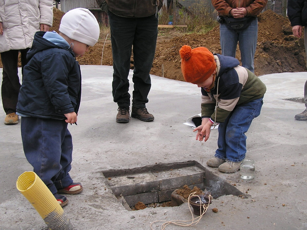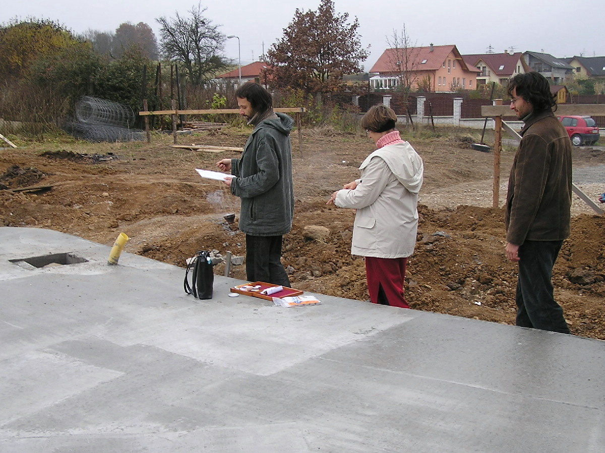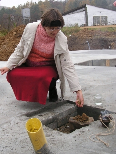 Na začátku stavby jsme společně s majiteli oslavili položení základního kamene stavby. Je to tradiční způsob jak navázat spolupráci s elemtárními bytostmi místa. Je to oslavný rituál, jak být v souladu s jemnými energiemi tzv. vědomí místa (duše místa). Každý člověk vytváří svým jednáním a novými záměry nové vztahy s elementárními bytostmi. Položení základního kamene je akt, kdy se majitelé spojují s nápomocnými bytostmi, které jim budou v životě v tomto domě pomáhat.  Rituál položení základního kamene jsme slavili společně s dětmi a příbuznými majitelů. Základní kámen je uložen hluboko pod podlahou domu. Během jeho pokládání byl symbolicky zasypán zemí, pokropen vodou, ovoněn dýmem vonné tyčinky a osvícen plamenem svíčky. Zazněly oslavné verše pro místo a poděkování všem bytostem spojených s místem. Od dokončení domu již uběhlo několik let. Dodnes jsou majitelé šťastní a v domě se jim dobře bydlí.