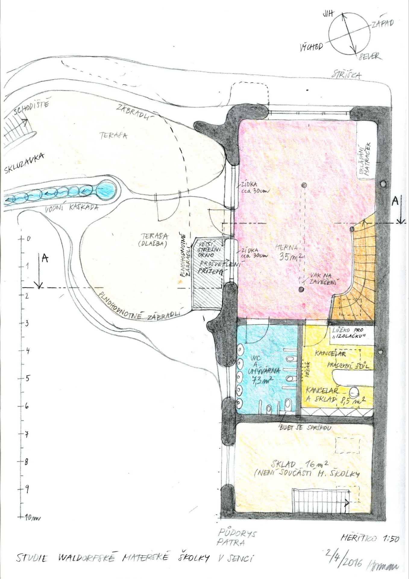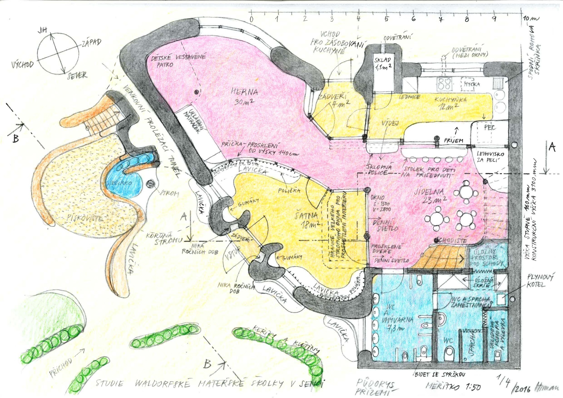 Návrh vznikl při společném workshopu, kterého se zůčastnili zakladatelé školky, učitelé a rodiče. Metoda skupinové práce na návrhu podporuje tvorbu společenství a vnáší do procesu tvořivost a fantazii. Záměrem projektu je vytvořit živé organické tvary. Stavba bude realizována ze zdravých přírodních materiálů.