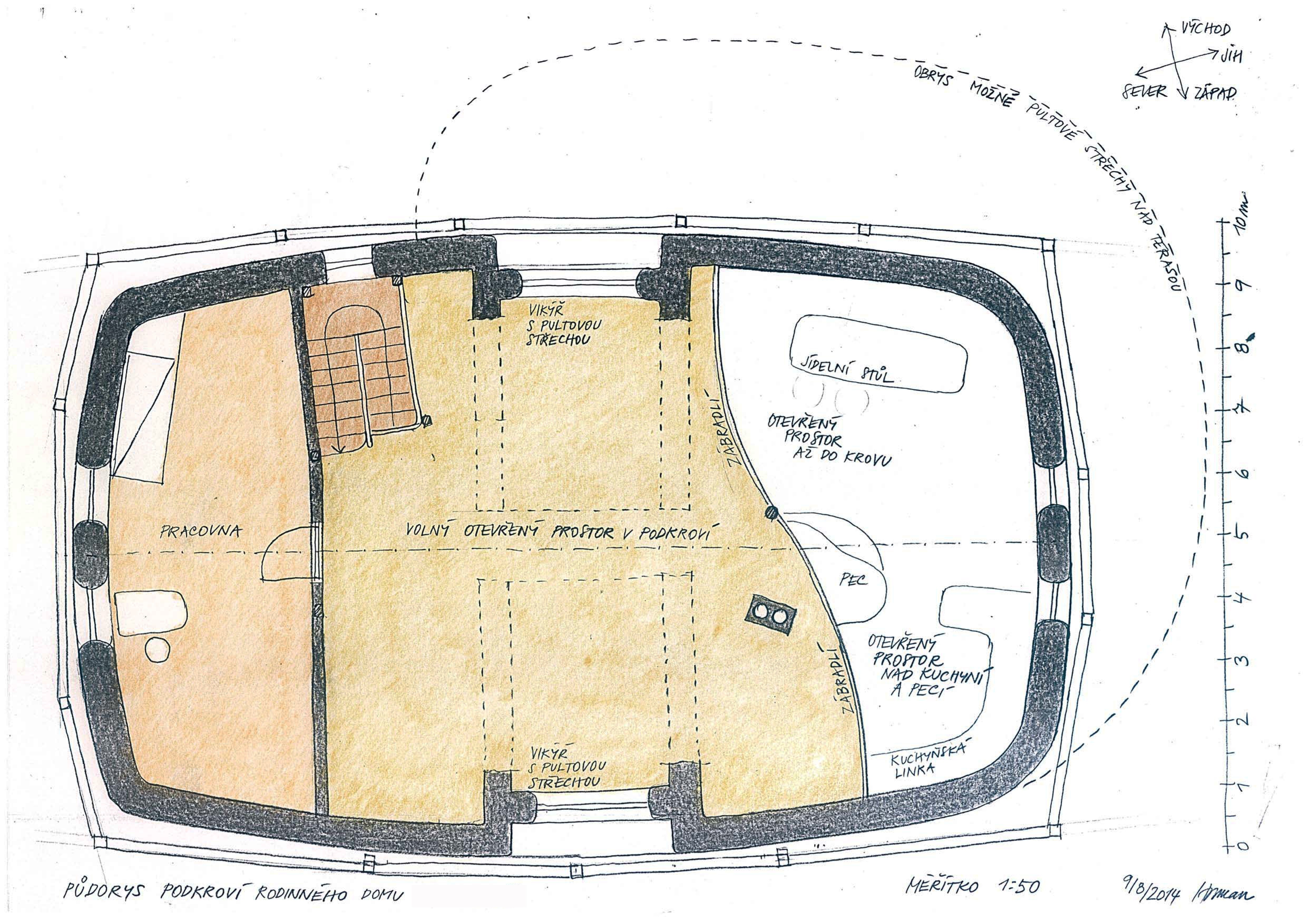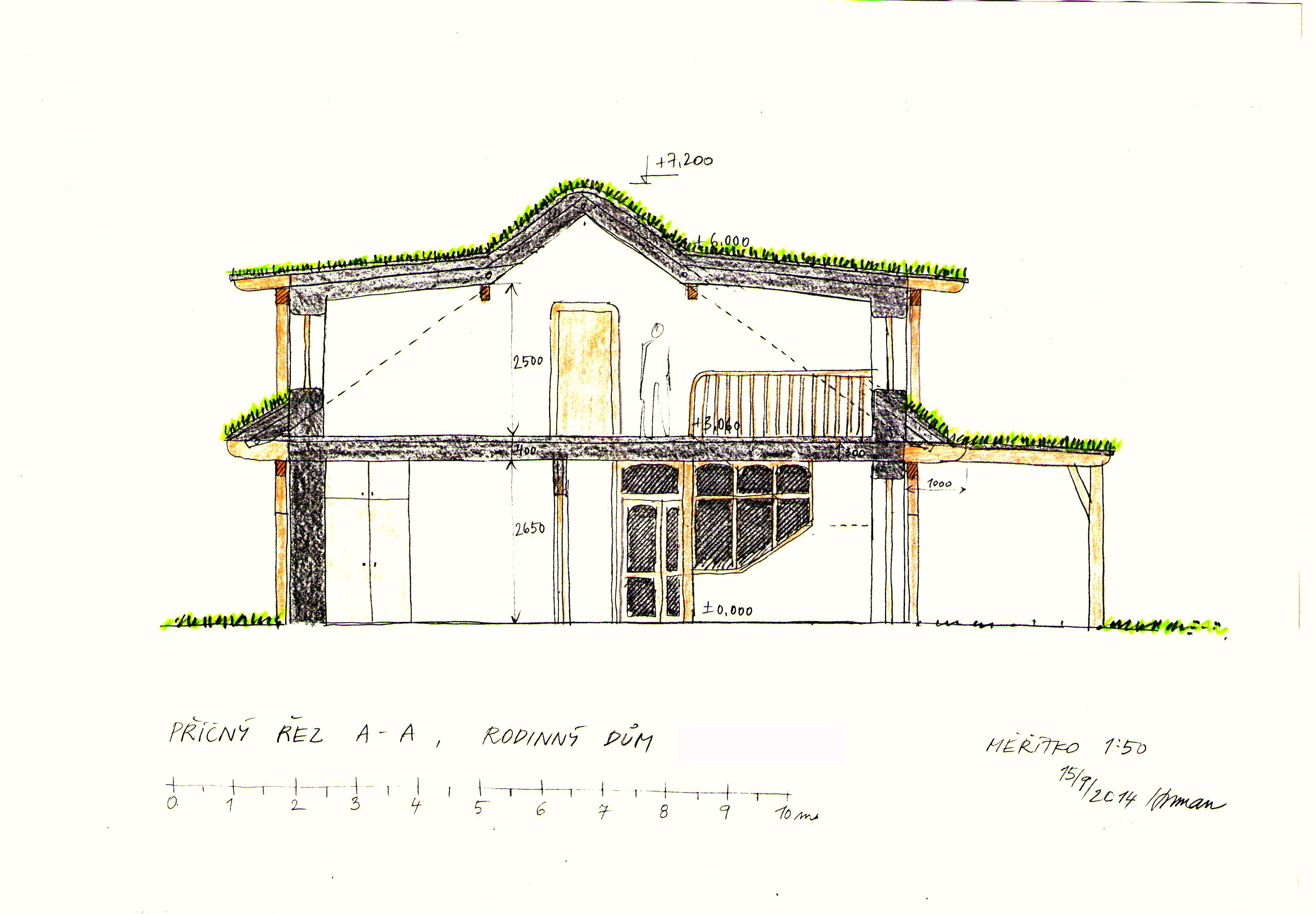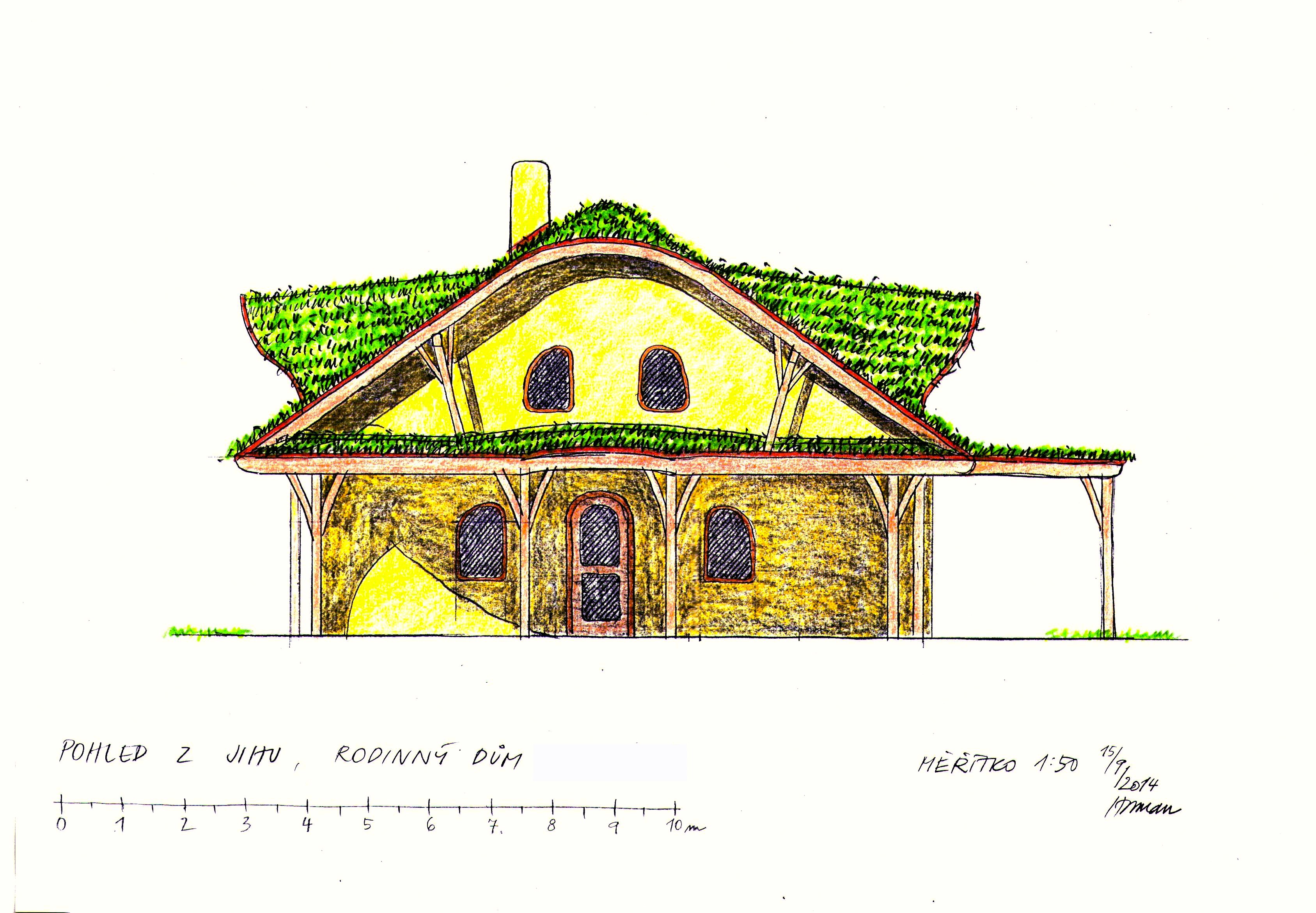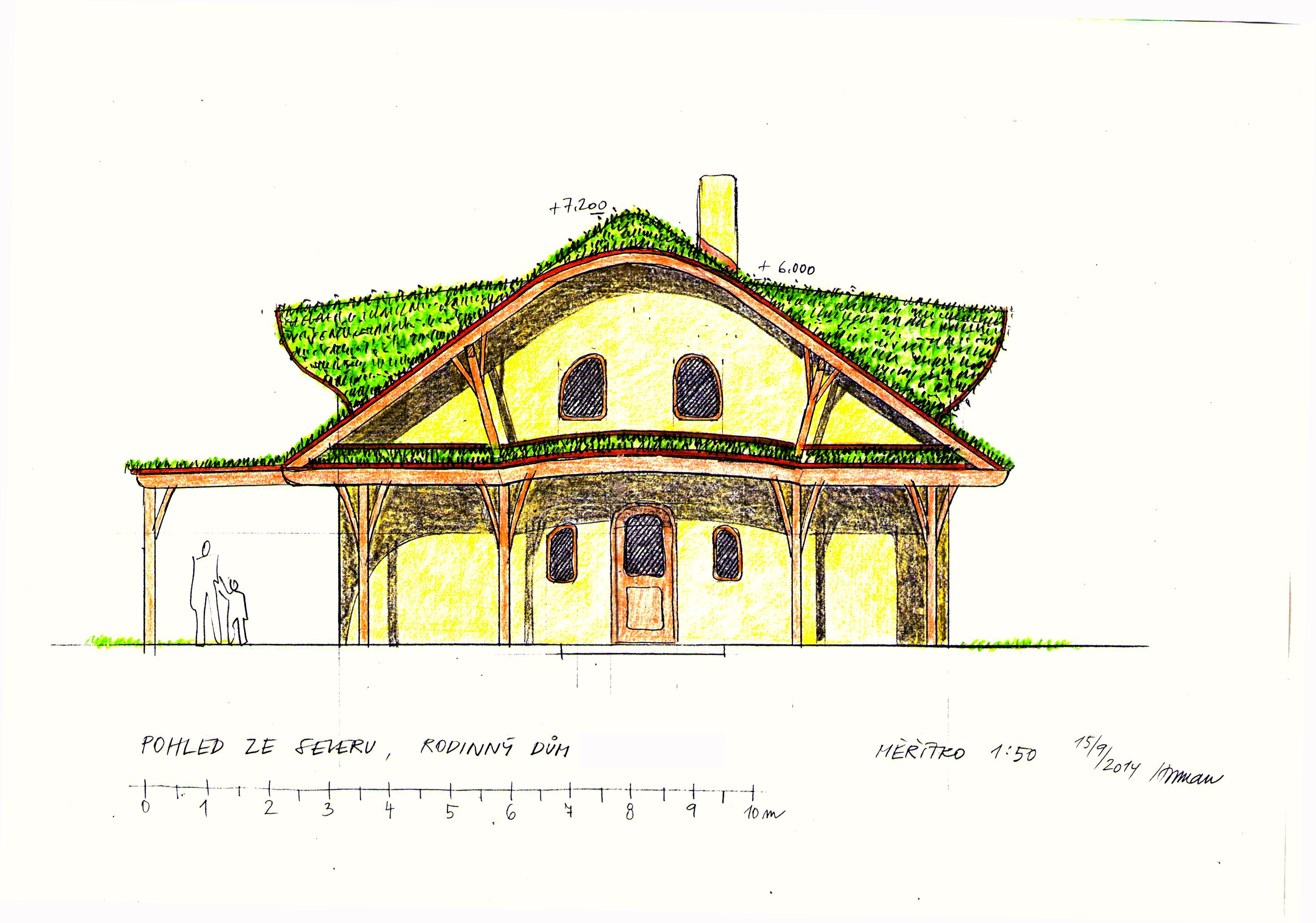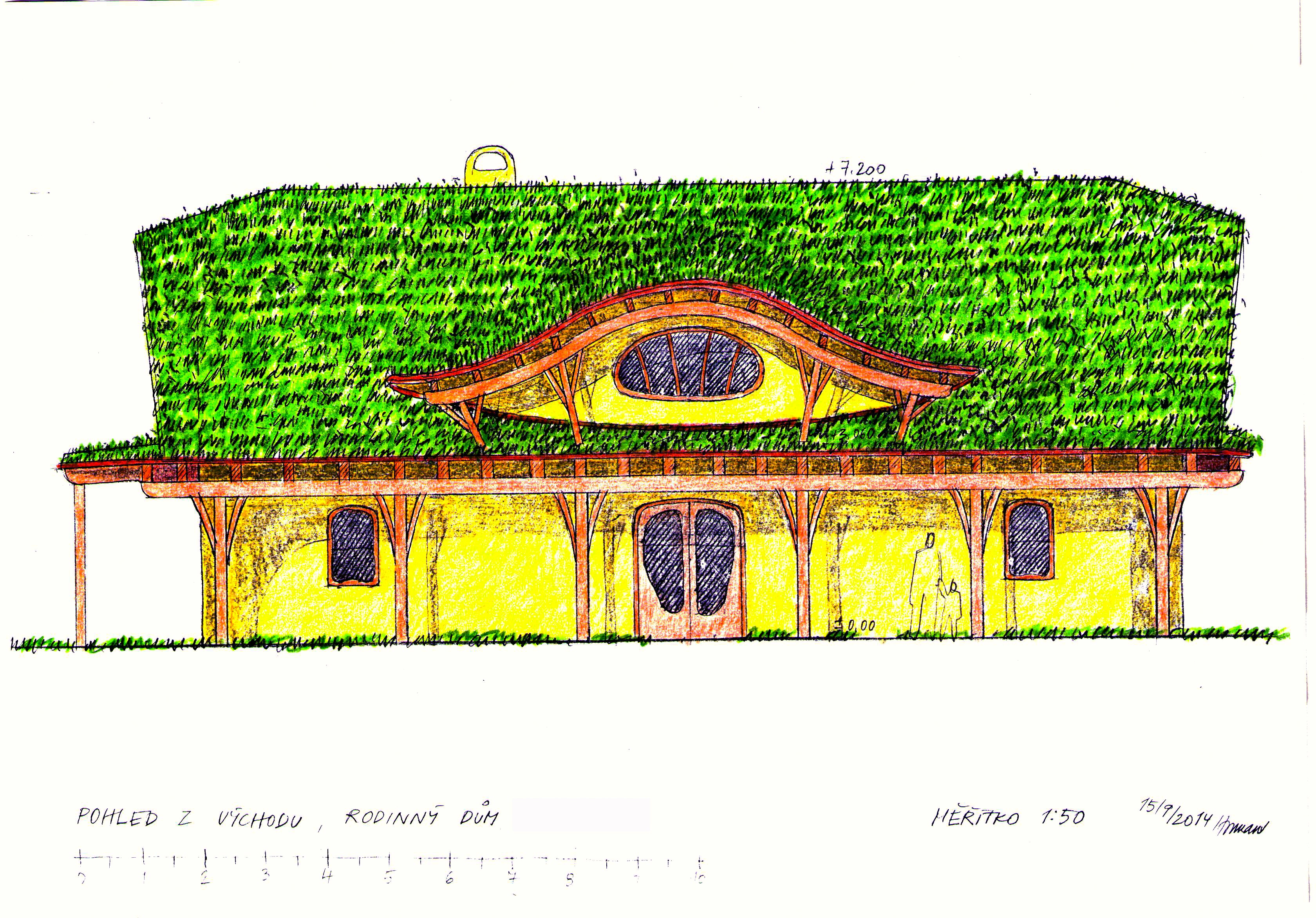 Dřevostavba se samonosnými obvodovými stěnami ze slaměných balíků. Vnitřní hrázděné příčky jsou vyzdívané nepálenými cihlami. Projekt dřevěné konstrukce domu je podrobně rozkreslen. Obvodové stěny tvoří staticky nosné sloupky. Jsou vně obvodové stěny. Obvodovou stěnu tvoří samonosné stěny z lisovaných slaměných balíků. Uvažovány jsou hliněné omítky. Hlavním zdrojem tepla bude akumulační elektrický boiler nebo plynový kotel. V domě je navržena jako doplňkový zdroj tepla pec na dřevo.