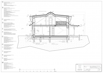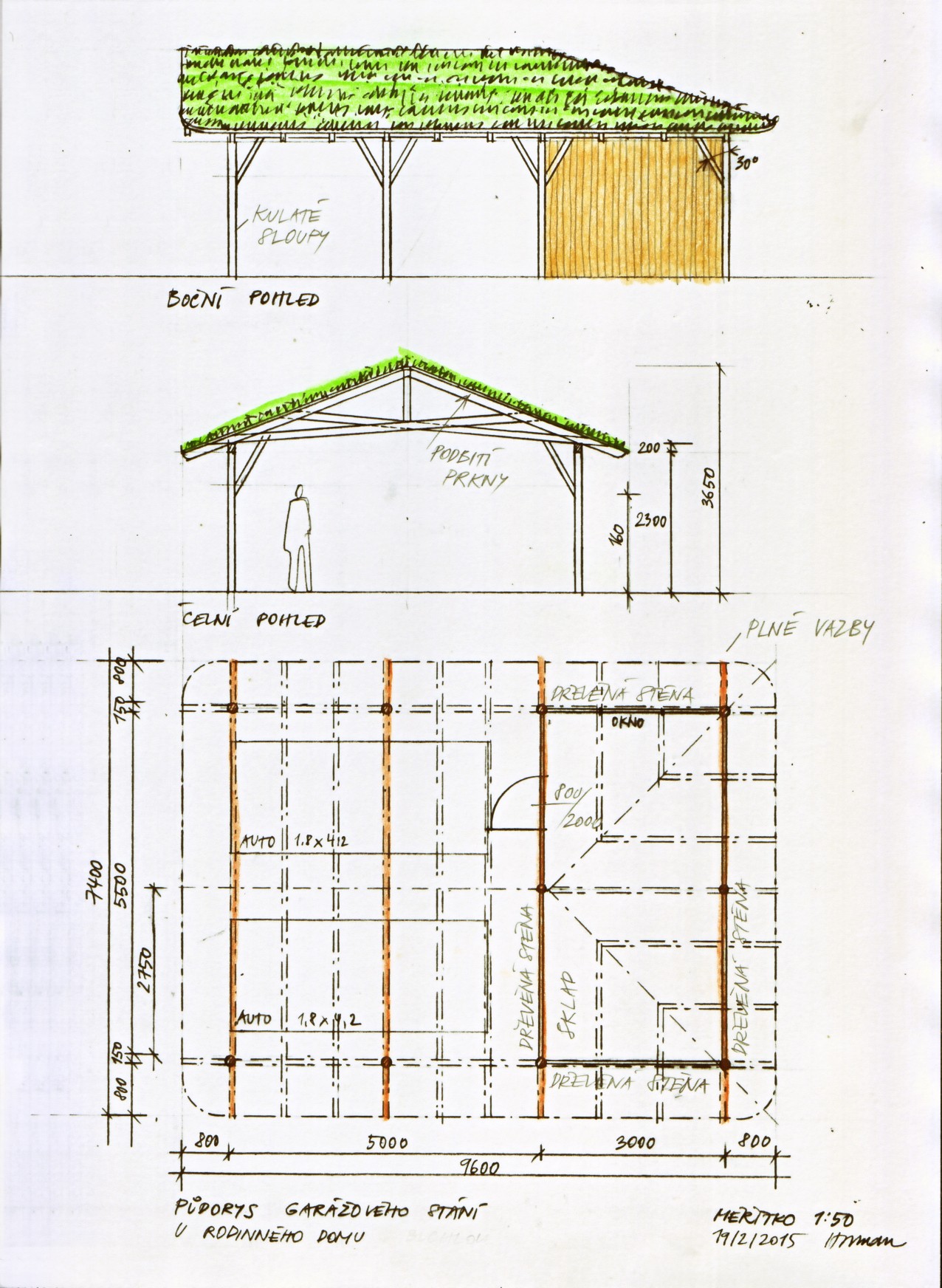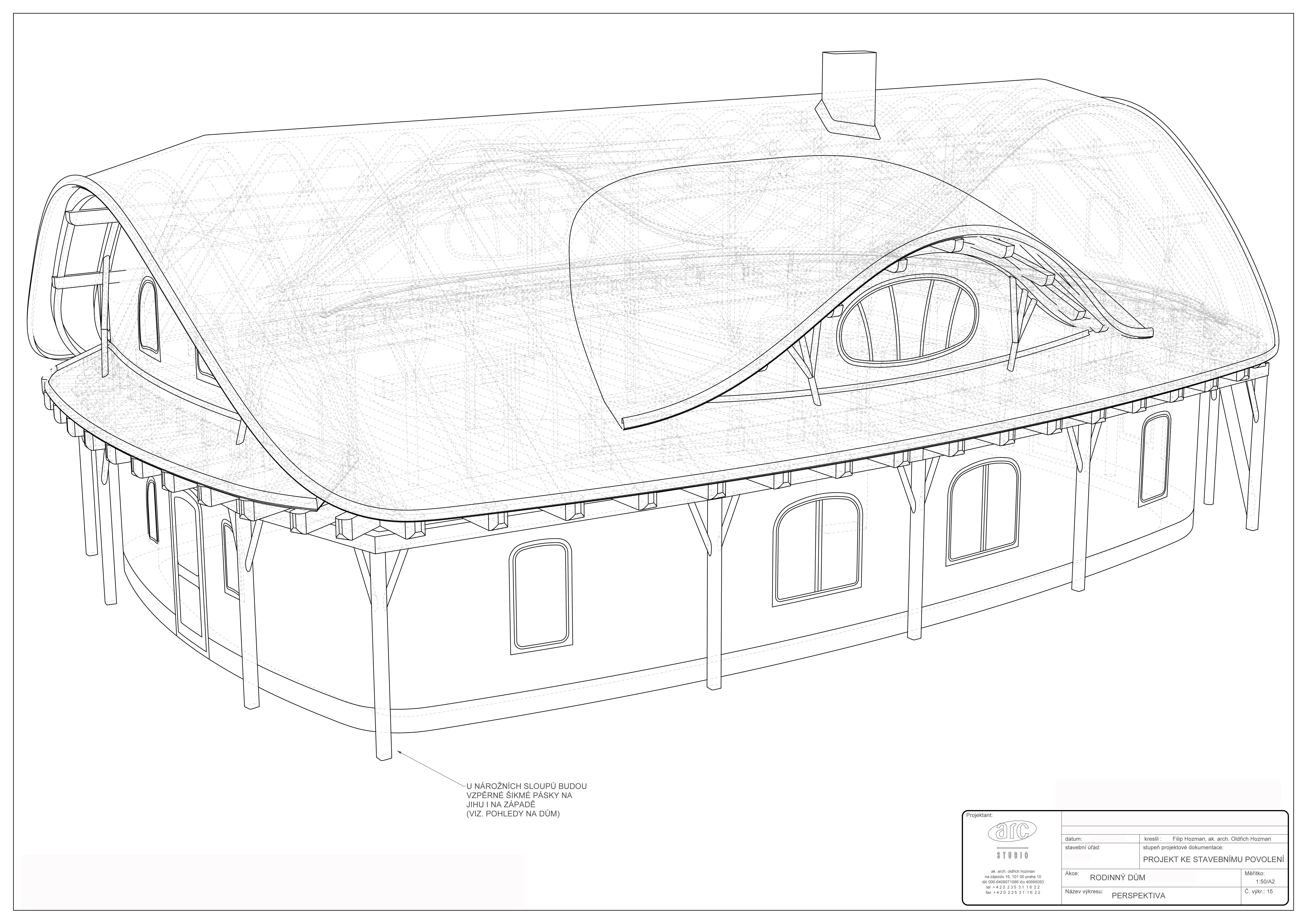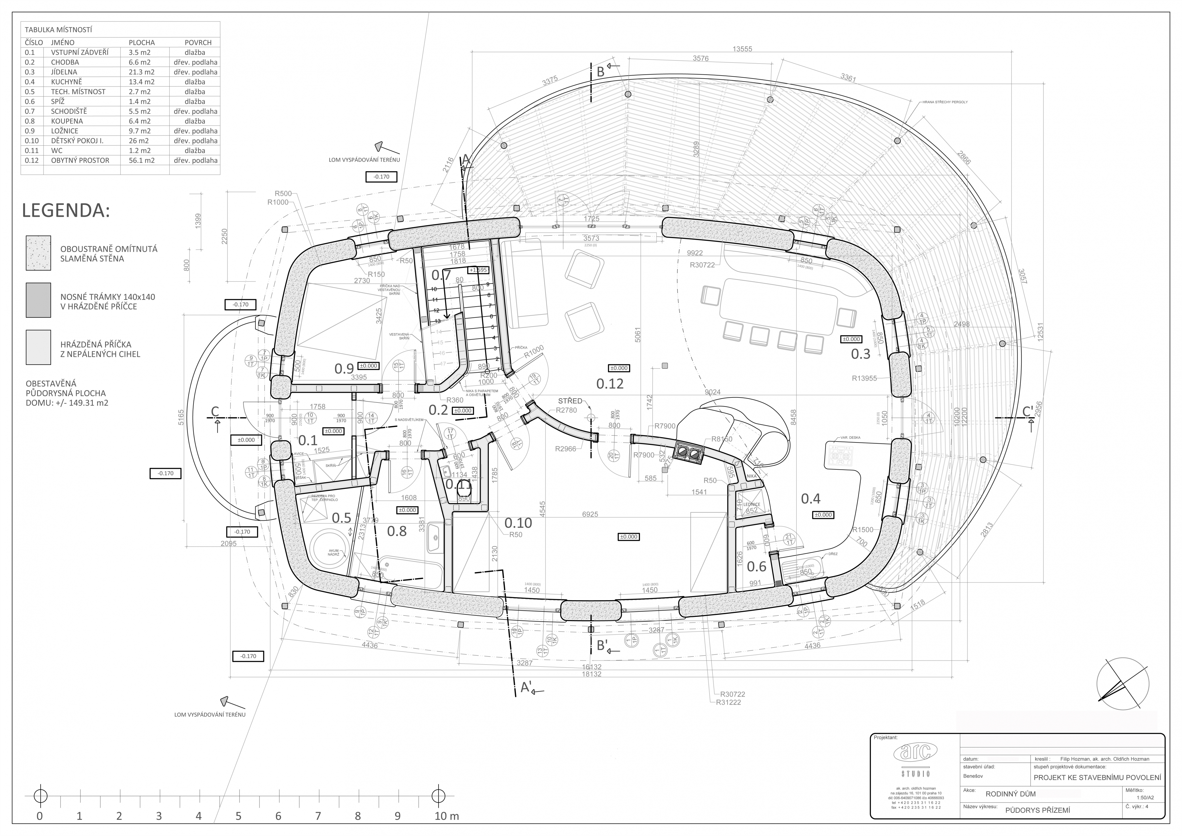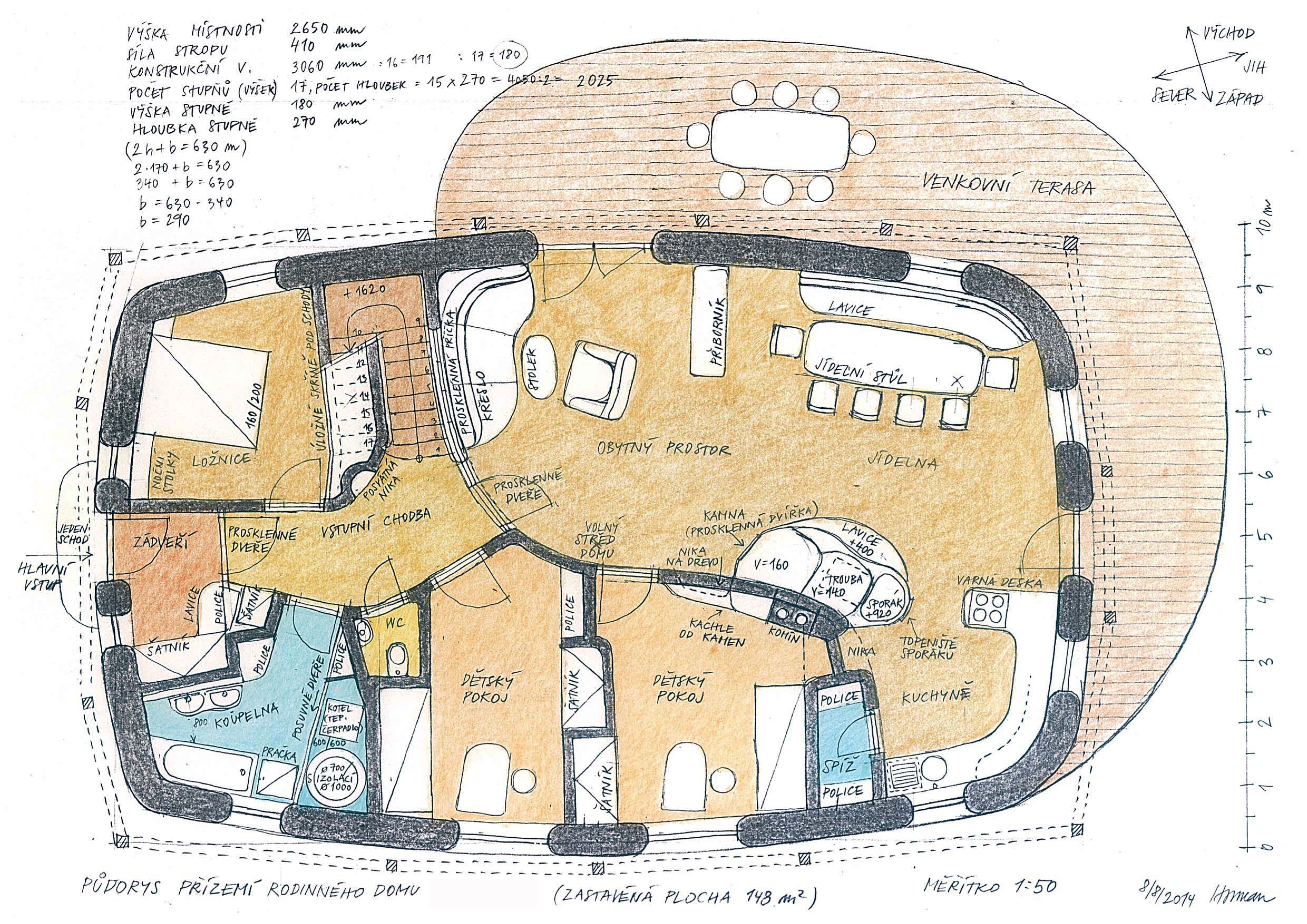 Dřevostavba se samonosnými obvodovými stěnami ze slaměných balíků. Vnitřní hrázděné příčky jsou vyzdívané nepálenými cihlami. Projekt dřevěné konstrukce domu je podrobně rozkreslen. Obvodové stěny tvoří staticky nosné sloupky. Jsou vně obvodové stěny. Obvodovou stěnu tvoří samonosné stěny z lisovaných slaměných balíků. Uvažovány jsou hliněné omítky. Hlavním zdrojem tepla bude akumulační elektrický boiler nebo plynový kotel. V domě je navržena jako doplňkový zdroj tepla pec na dřevo.