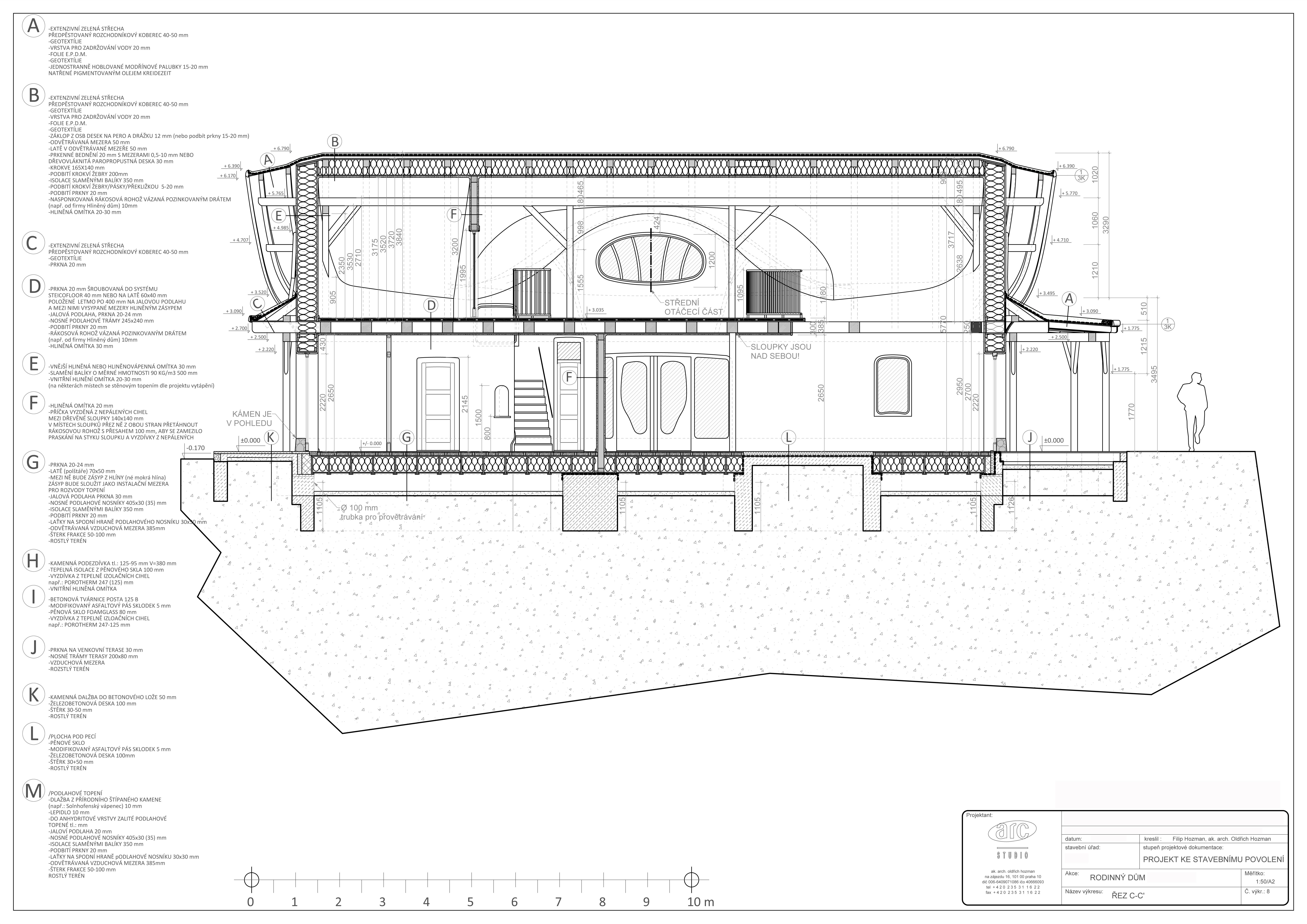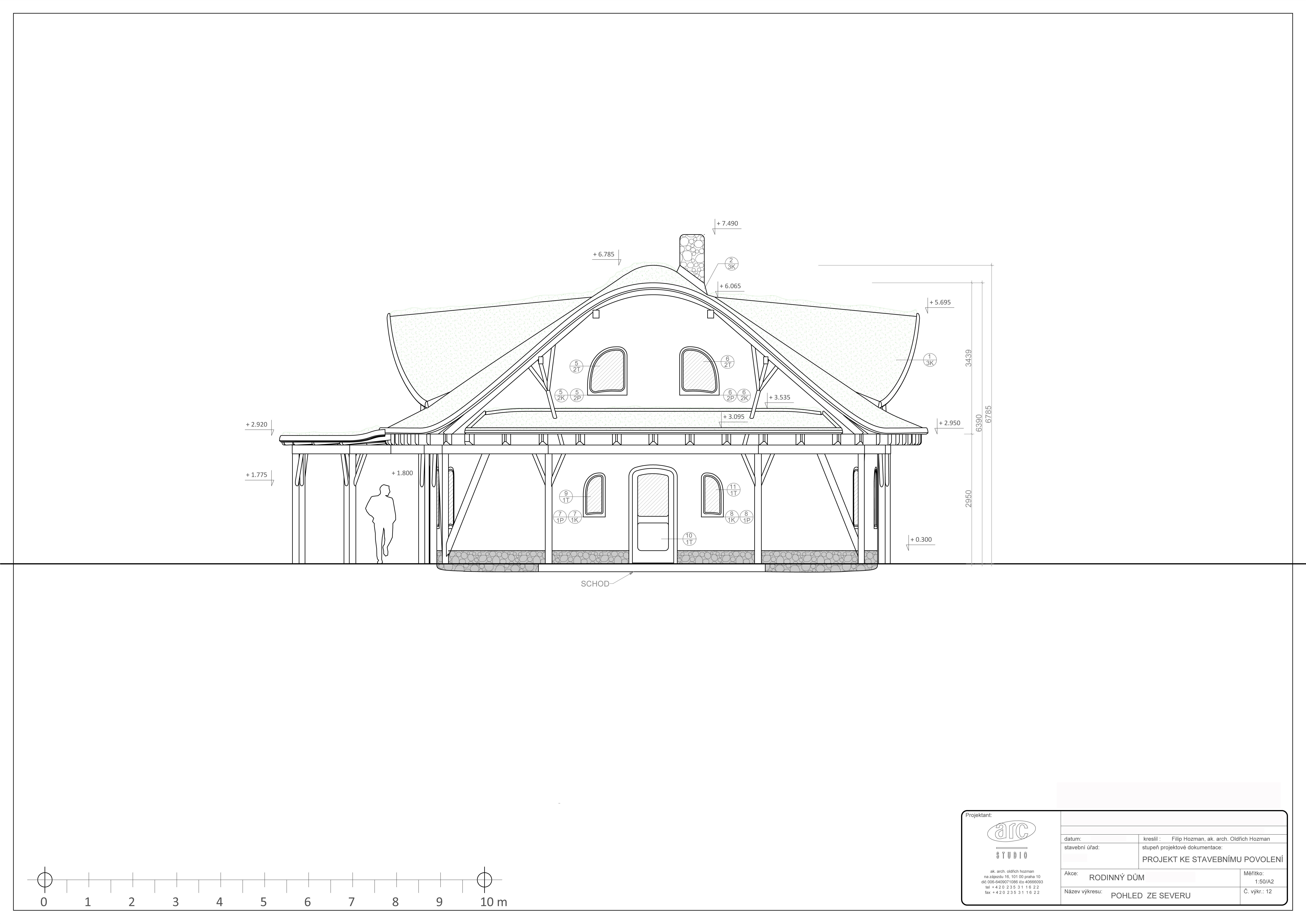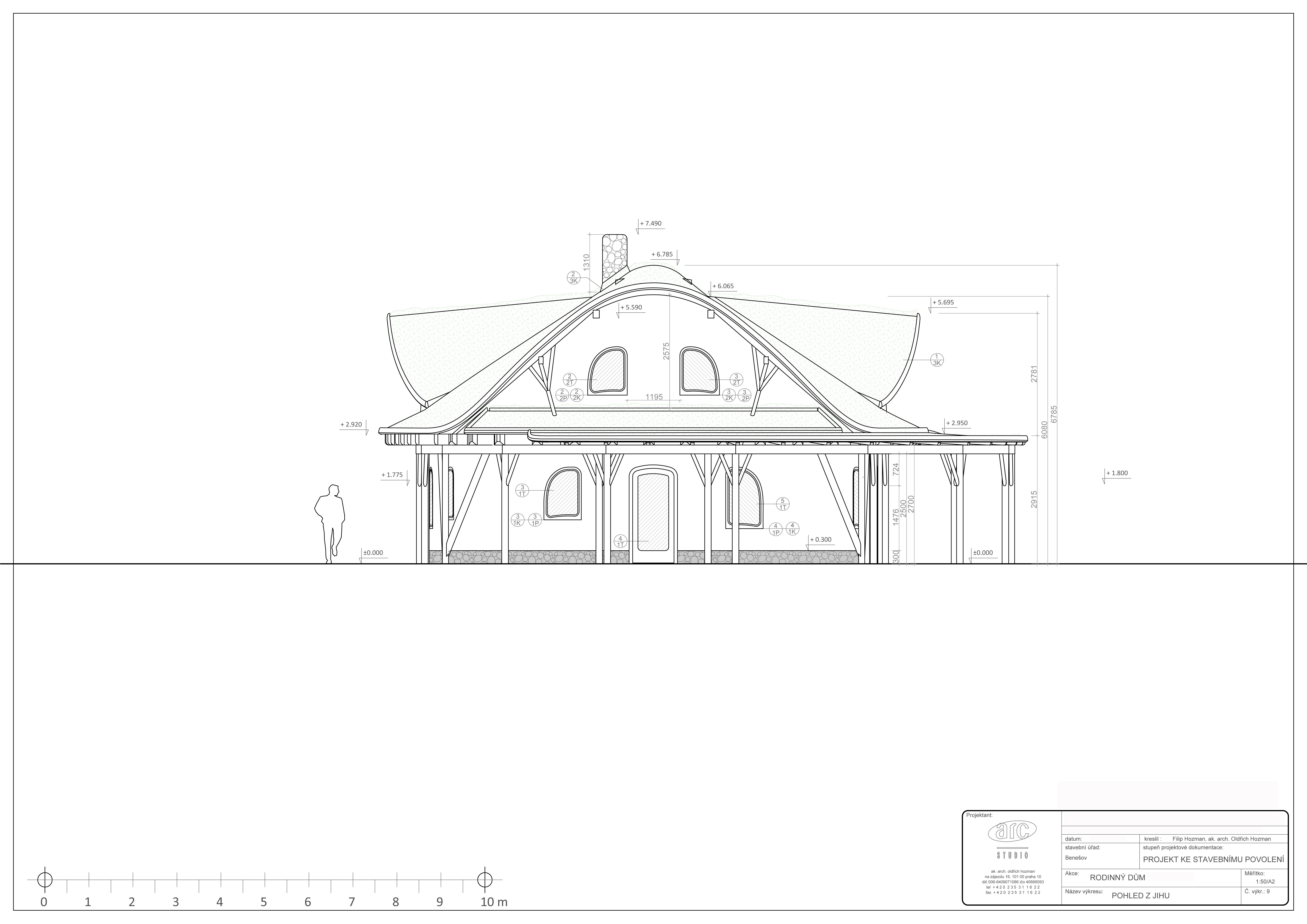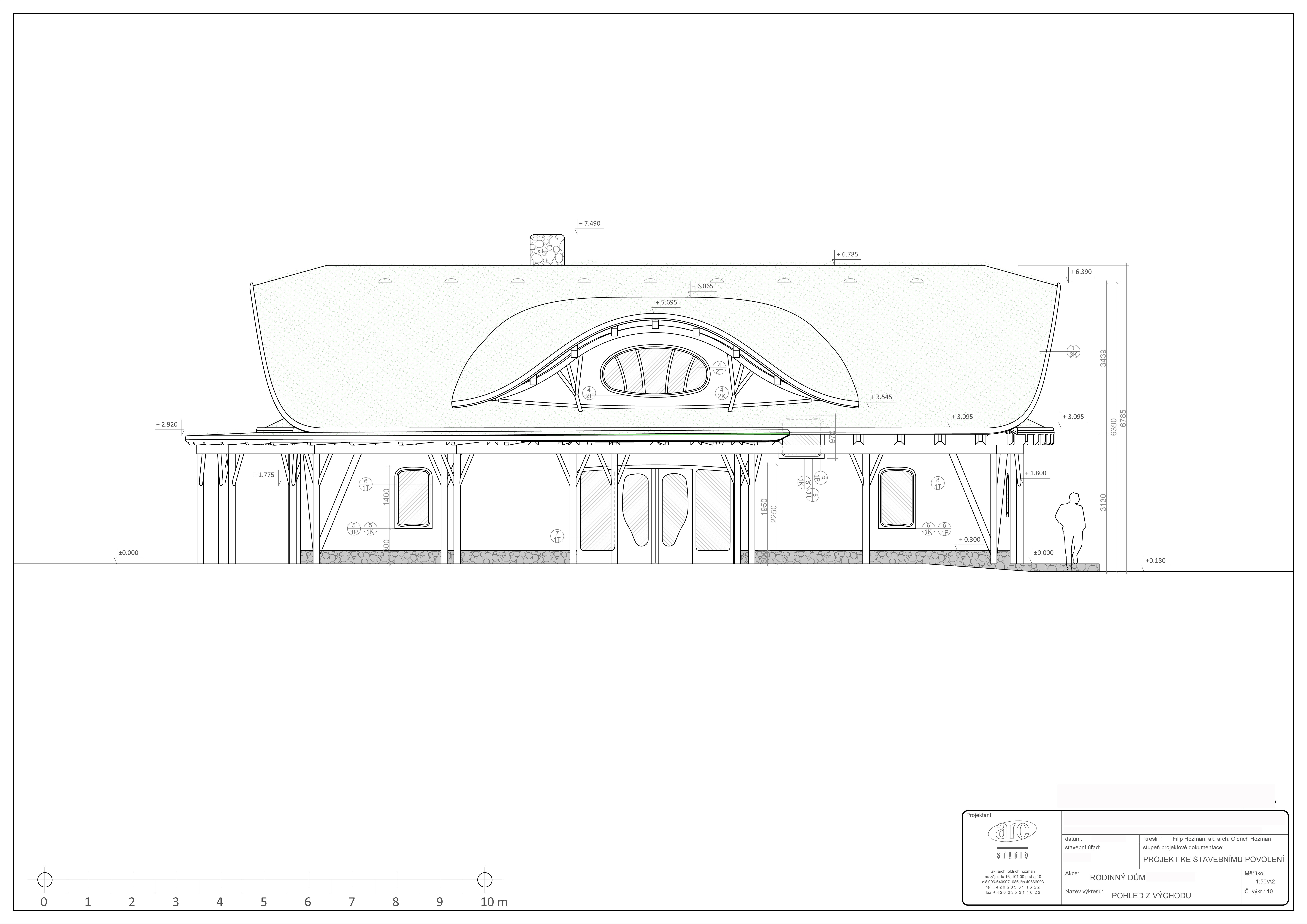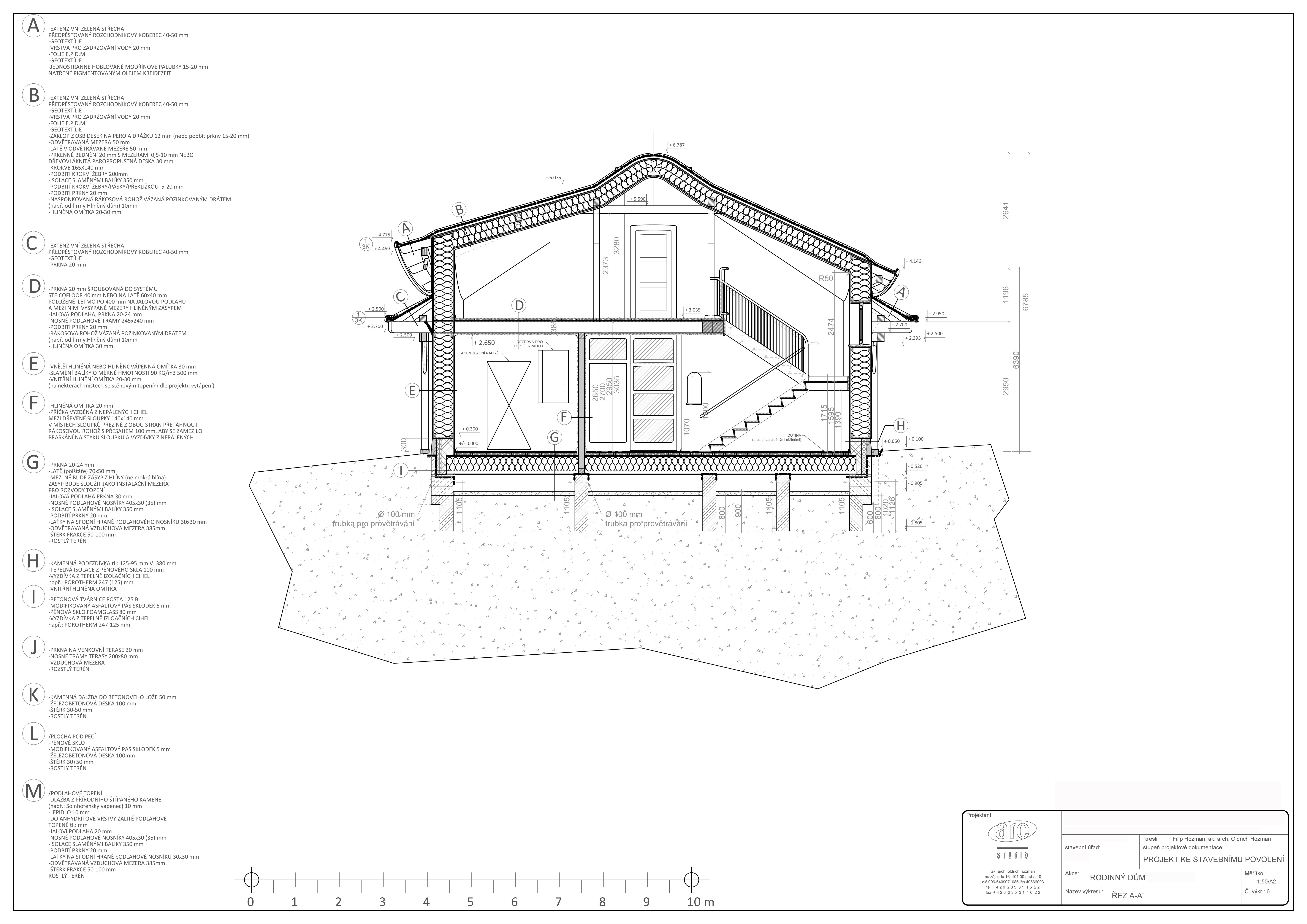Dřevostavba se samonosnými obvodovými stěnami ze slaměných balíků. Vnitřní hrázděné příčky jsou vyzdívané nepálenými cihlami. Projekt dřevěné konstrukce domu je podrobně rozkreslen. Obvodové stěny tvoří staticky nosné sloupky. Jsou vně obvodové stěny. Obvodovou stěnu tvoří samonosné stěny z lisovaných slaměných balíků. Uvažovány jsou hliněné omítky. Hlavním zdrojem tepla bude akumulační elektrický boiler nebo plynový kotel. V domě je navržena jako doplňkový zdroj tepla pec na dřevo.