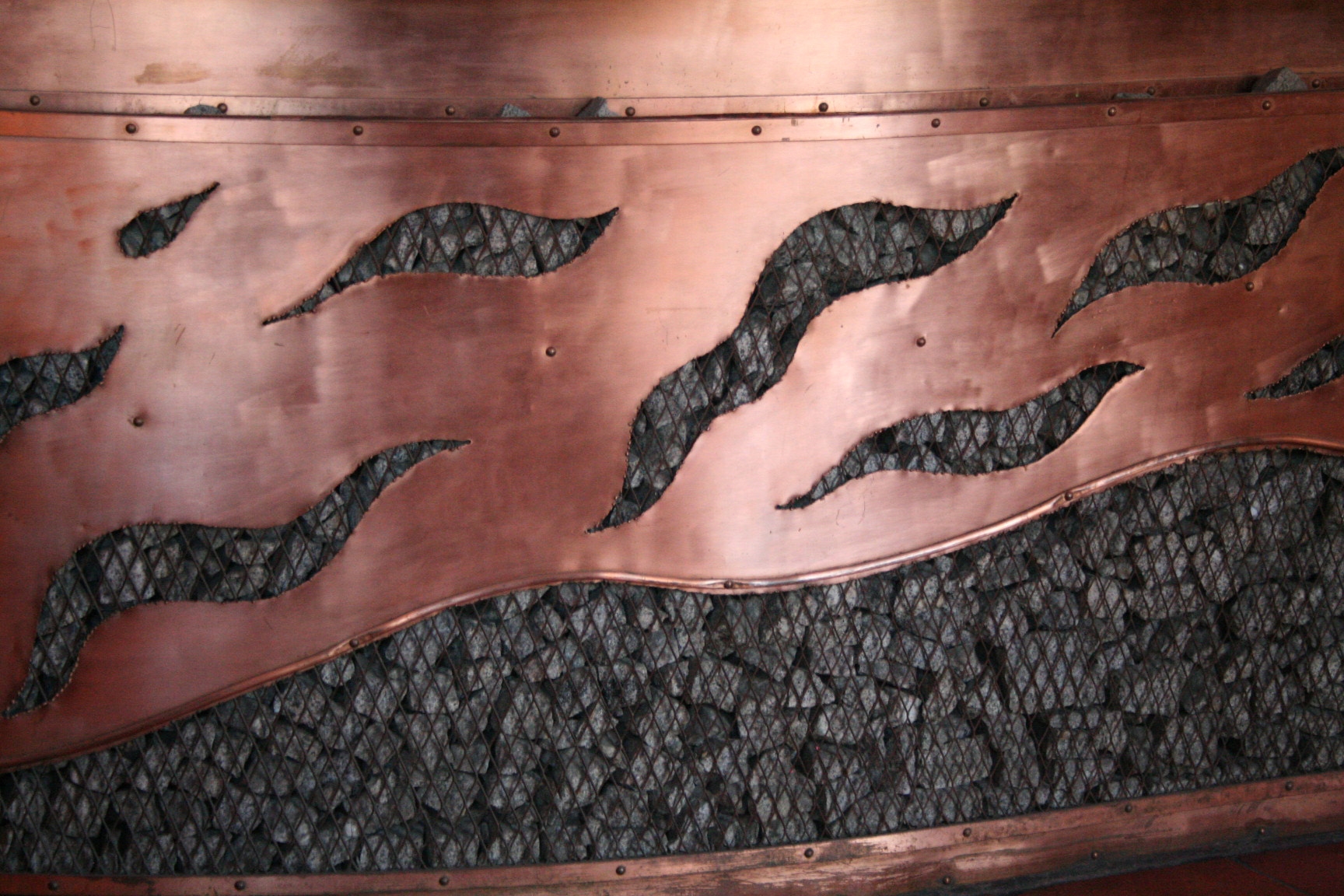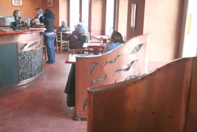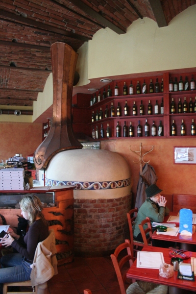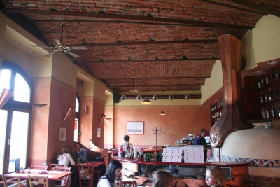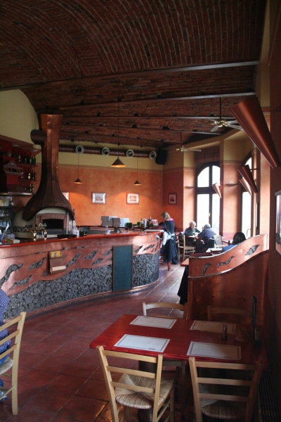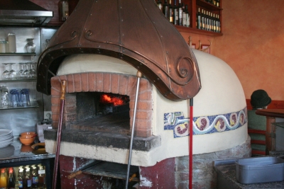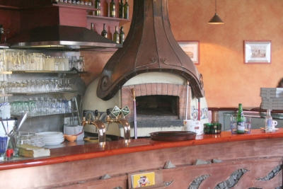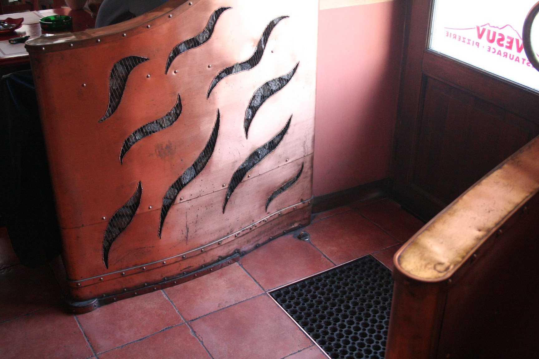 Interiér pizzerie Vesuv v Praze 8, Karlíně, Šaldova 34. Projekt vychází z principů feng shui. Hlavním motivem celého prostoru je pec na pizzu, která je vidět od hlavního vstupu.