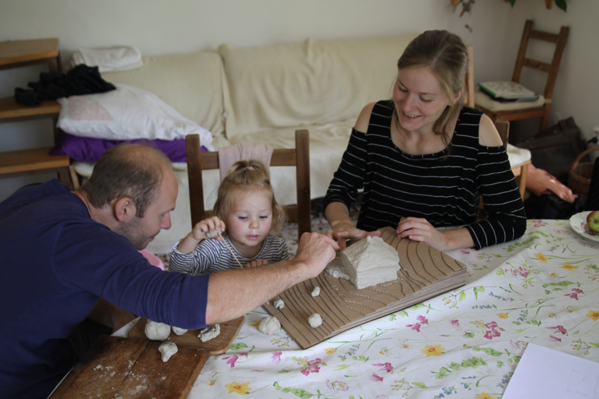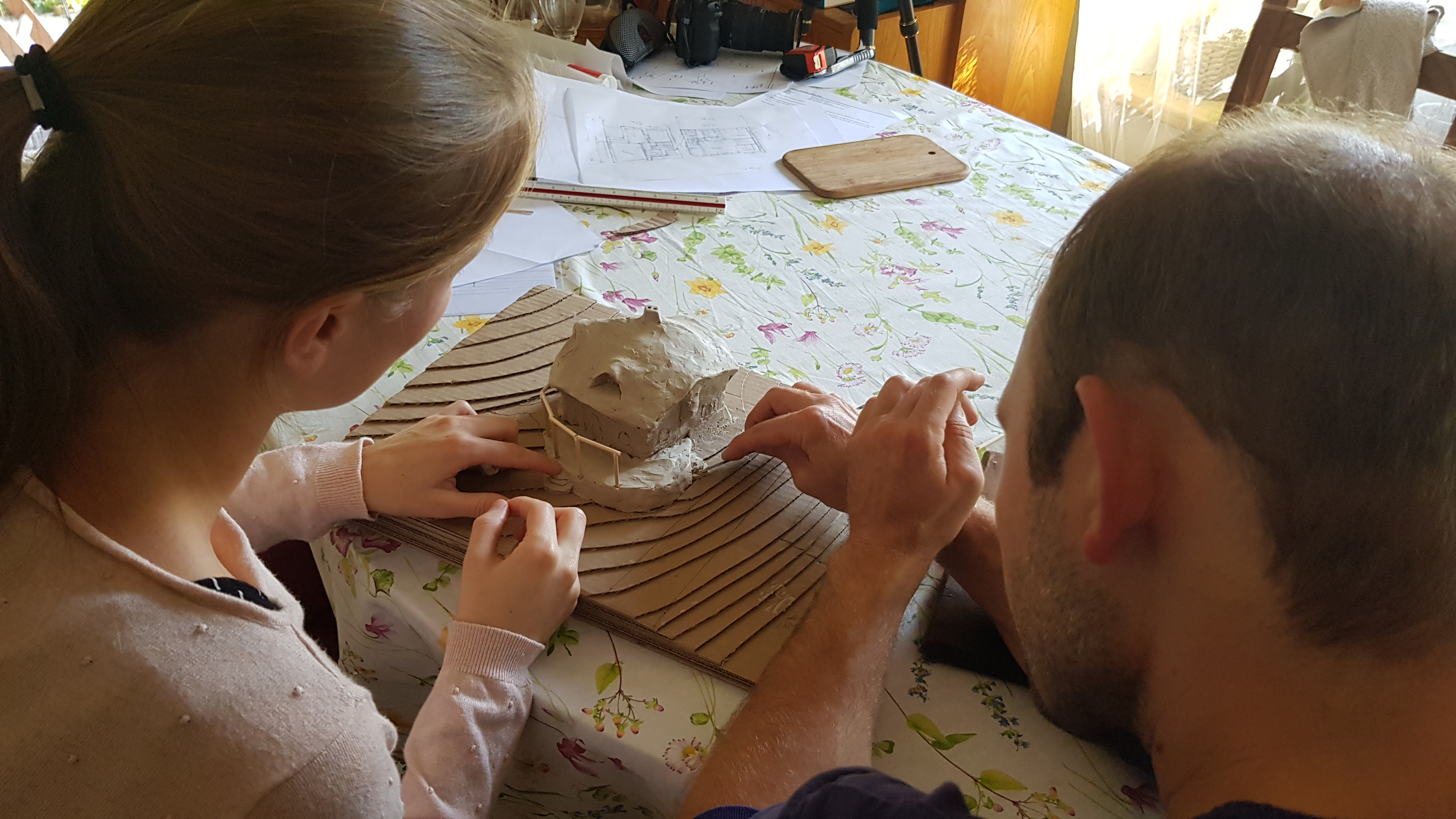 Na základě rozvahy o počtu místností a jejich orientaci ke světovým stranám jsme začali vytvářet model domu. Metoda společné práce umožňuje do procesu návrhu vnést nejenom síly myšlení, ale také síly cítění a vůle. Každý z členů rodiny vnáší do procesu tvorby modelu živost a radost. A velmi dobře vyciťuje souvislosti a navazuje na práci druhých. Tak se vytváří postupně společná shoda nad vznikem rodinného domu. Všichni zúčastnění se mohou lépe duševně spojit se vznikajícím návrhem.