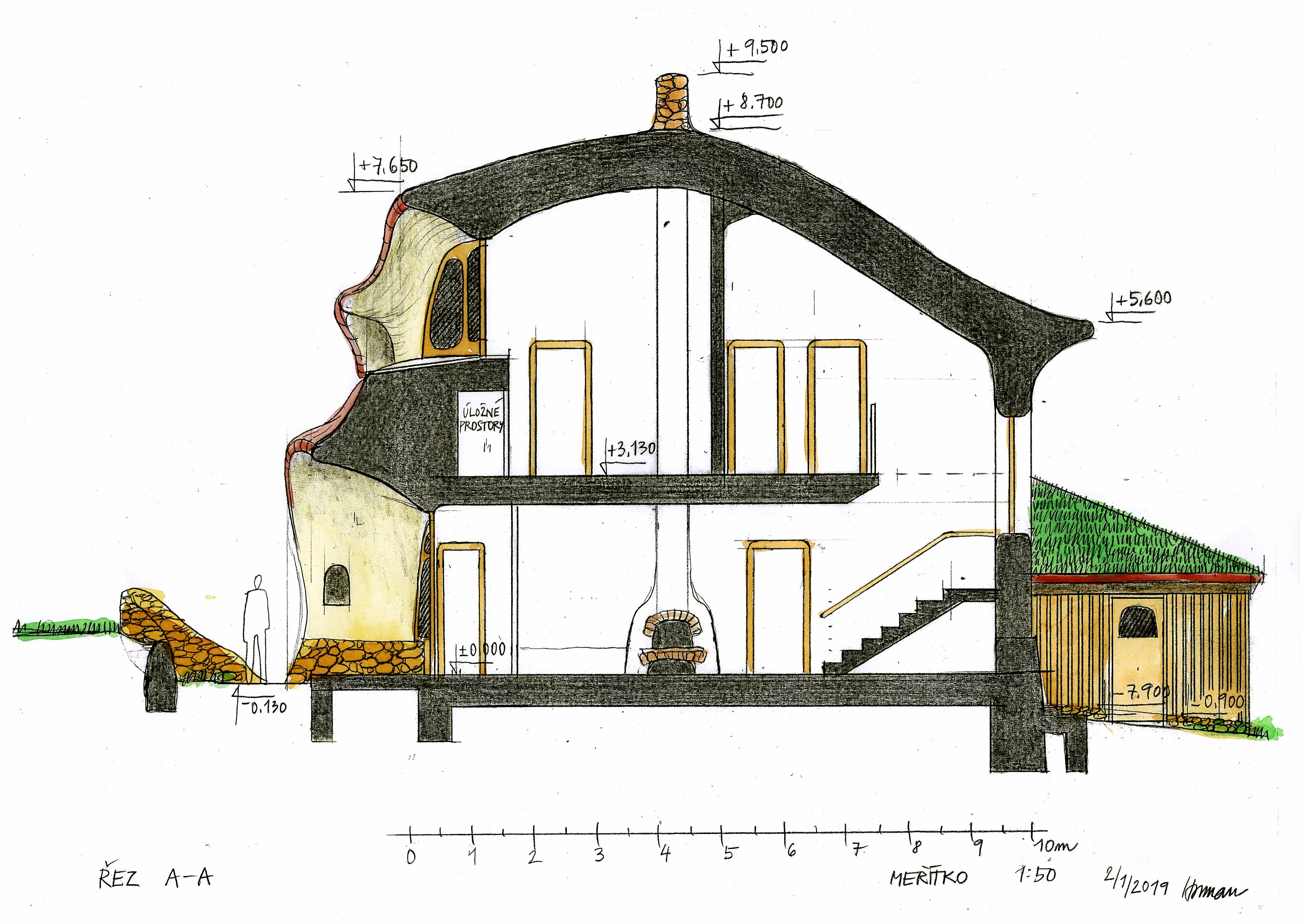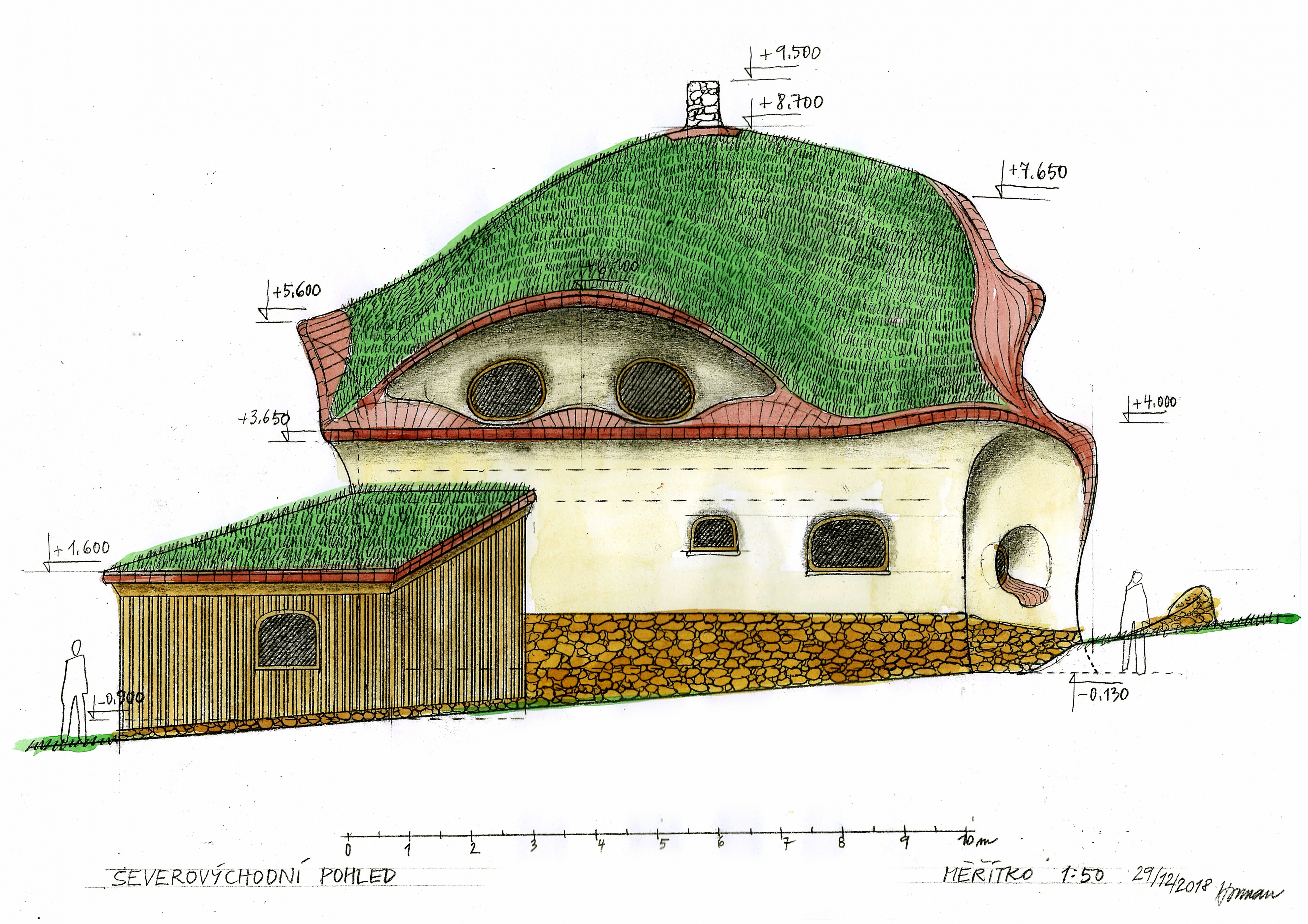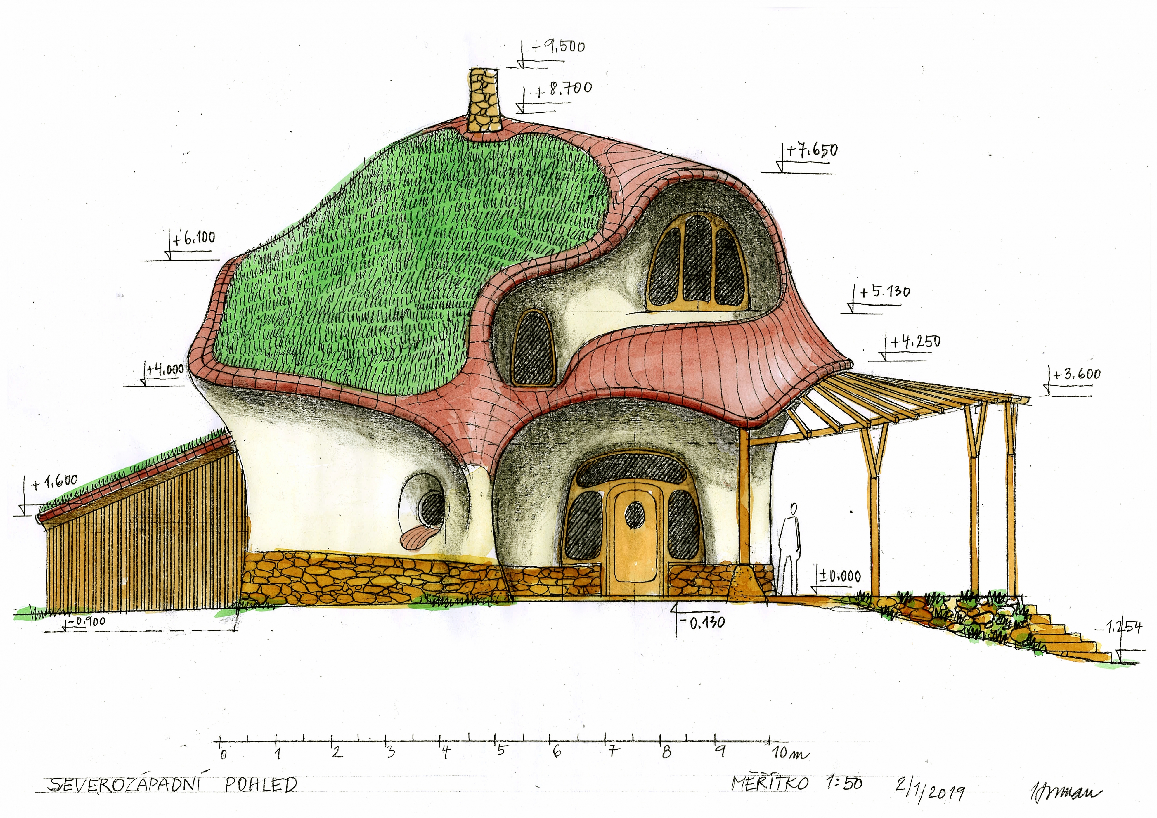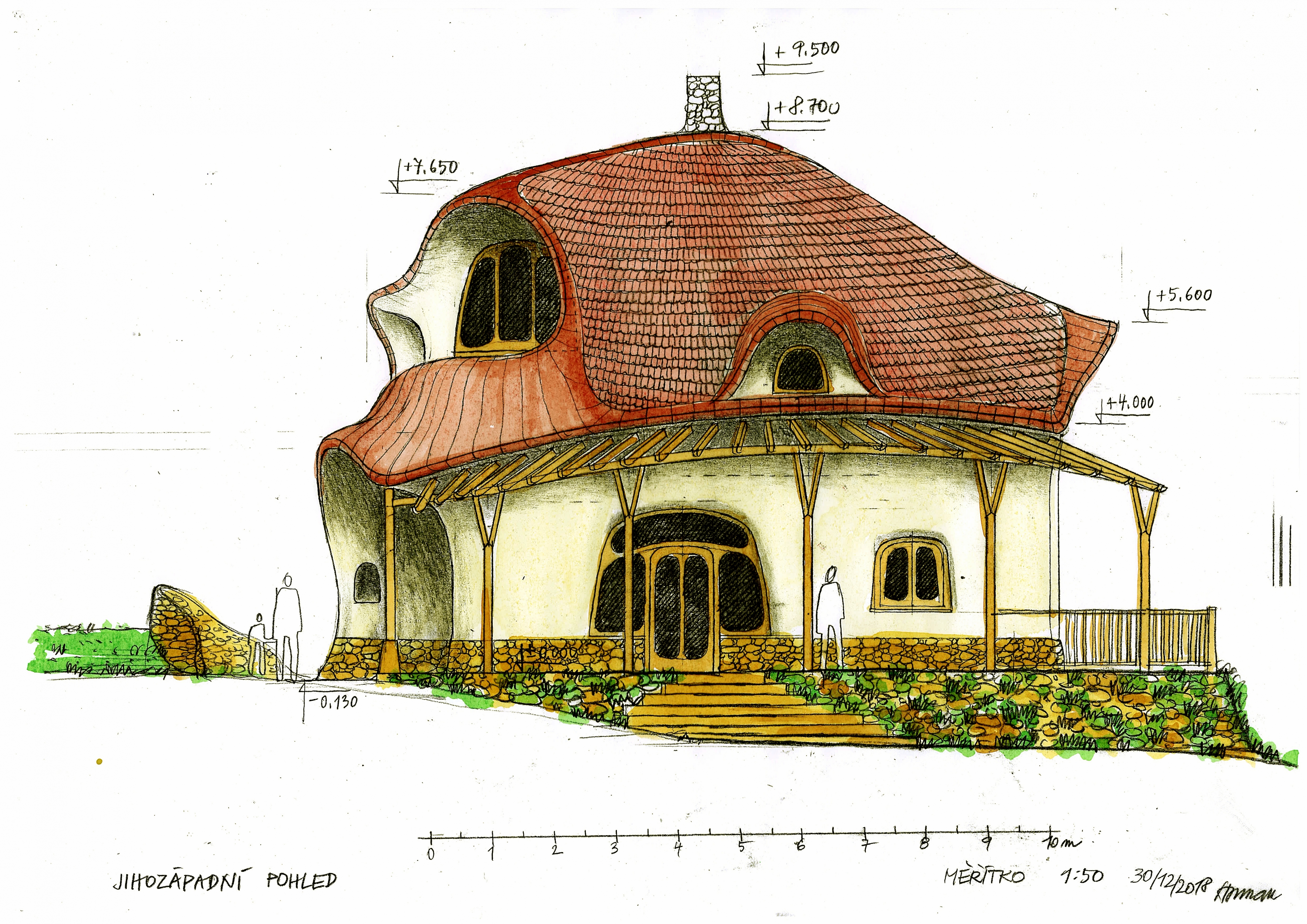 Projekt organicky tvarovaného nízkoenergetického rodinného domu ze zdravých přírodních materiálů. Obvodové stěny jsou zděné z tepelněizolačních cihel. Krov a stěny v 1. patře jsou celodřevěné (hrázděné). Půdorys domu je 9,5 x 9,5m. Dům má dřevěnou trámovou konstrukci stropů a podlah, vnitřních příček a střechy. Přirozené geomagnetické pole Země tak může zdravě prostupovat domem. Krov je zateplen 34 cm silnou izolací z přírodních materiálů. (slisovené slámy nebo z měkké dřevovláknité vlny). Stěny jsou prodyšné, difuzně otevřené. Veškeré vnitřní omítky jsou hliněné. Dům je přitápěn krbem na dřevo. Koncepce stavby obsahuje principy feng shui a sakrální geometrie.