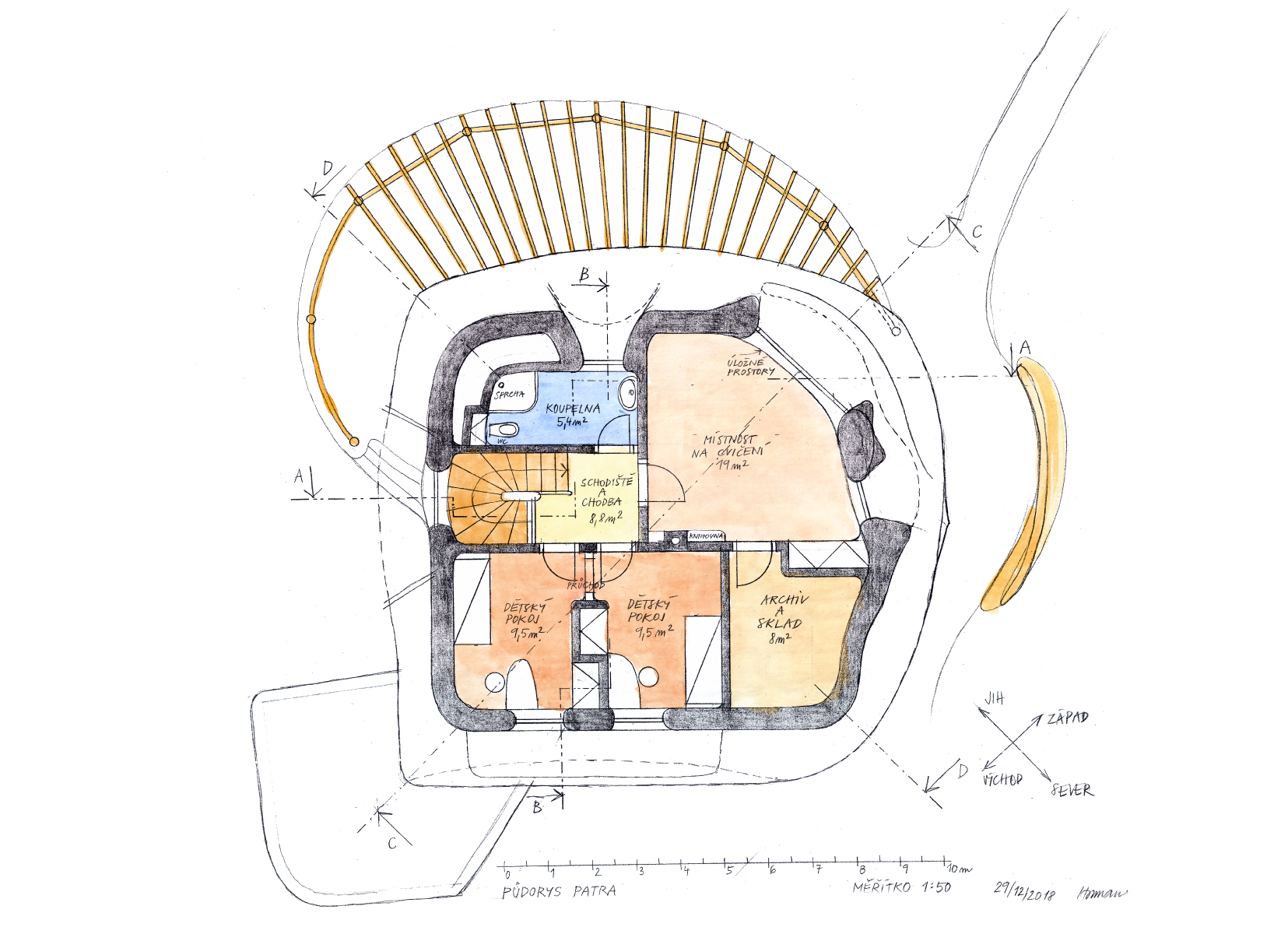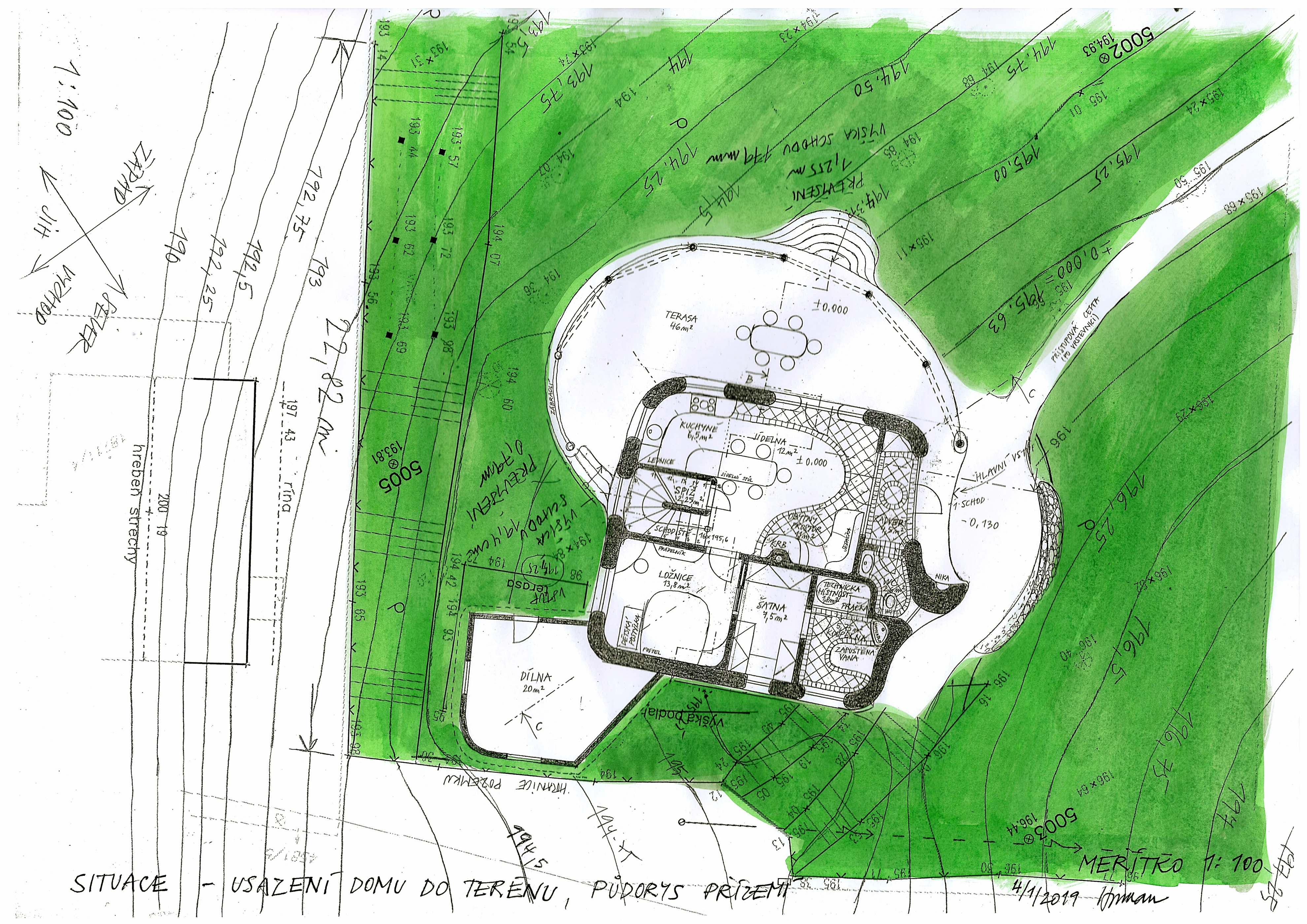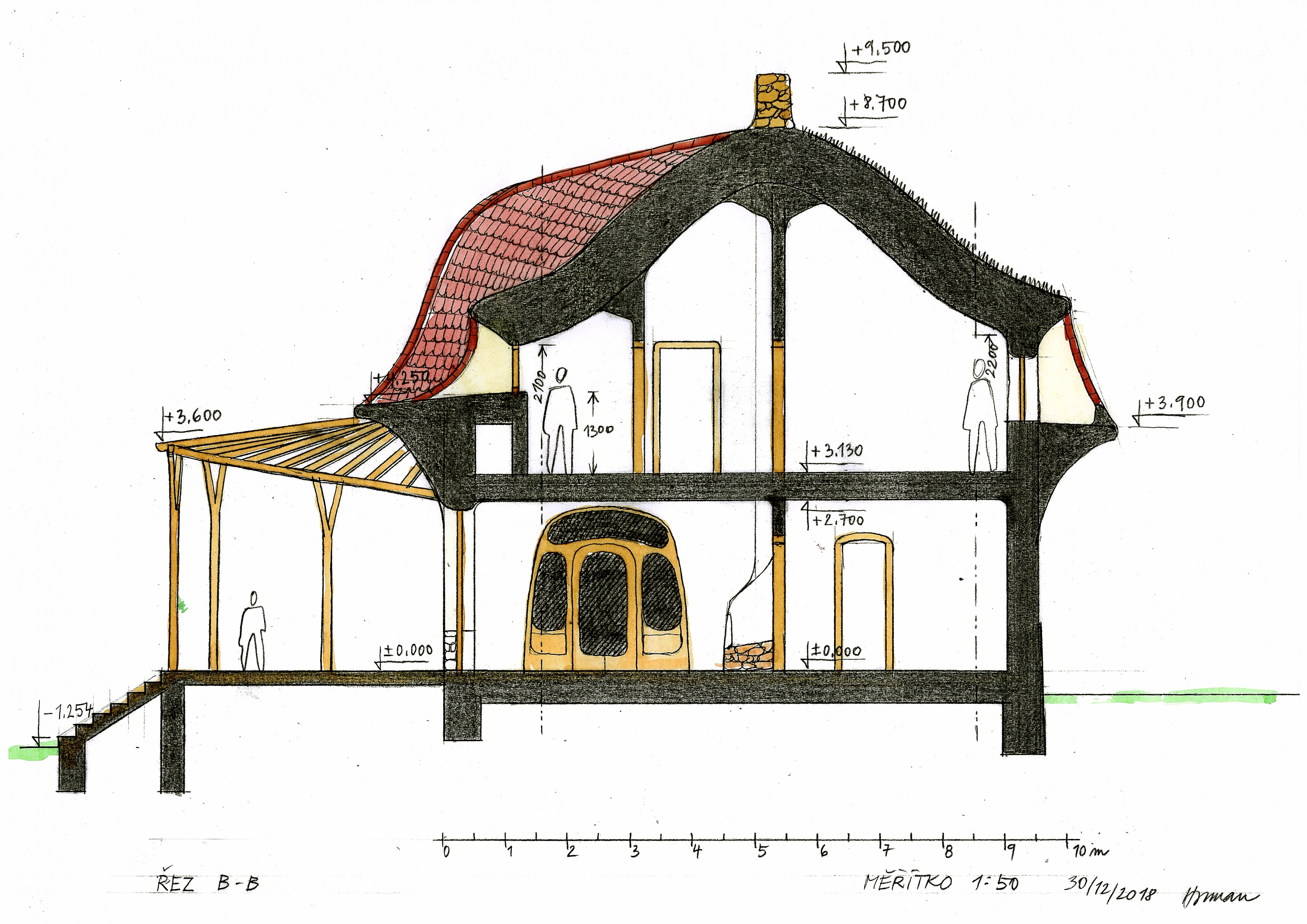 Projekt organicky tvarovaného nízkoenergetického rodinného domu ze zdravých přírodních materiálů. Obvodové stěny jsou zděné z tepelněizolačních cihel. Krov a stěny v 1. patře jsou celodřevěné (hrázděné). Půdorys domu je 9,5 x 9,5m. Dům má dřevěnou trámovou konstrukci stropů a podlah, vnitřních příček a střechy. Přirozené geomagnetické pole Země tak může zdravě prostupovat domem. Krov je zateplen 34 cm silnou izolací z přírodních materiálů. (slisovené slámy nebo z měkké dřevovláknité vlny). Stěny jsou prodyšné, difuzně otevřené. Veškeré vnitřní omítky jsou hliněné. Dům je přitápěn krbem na dřevo. Koncepce stavby obsahuje principy feng shui a sakrální geometrie.