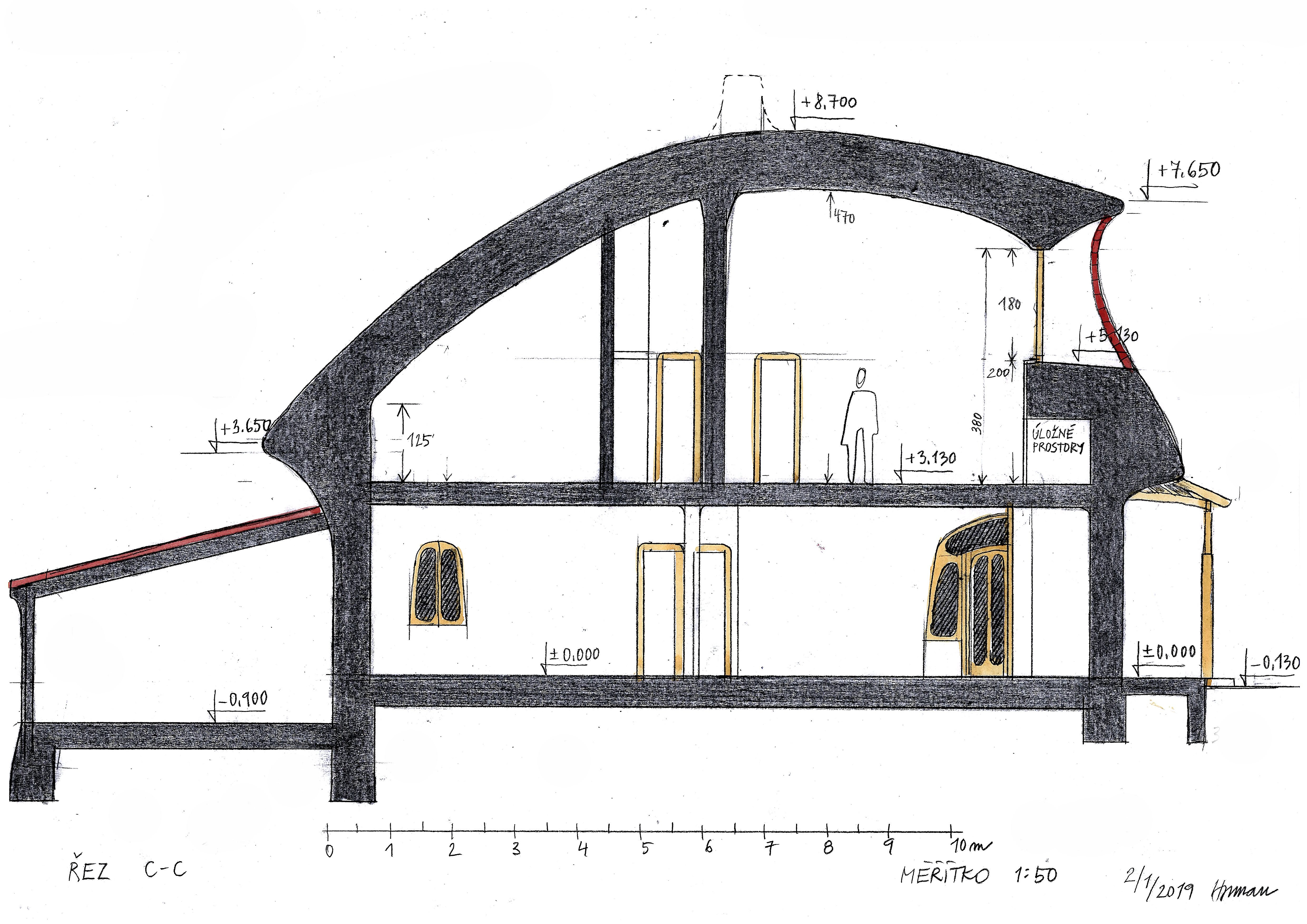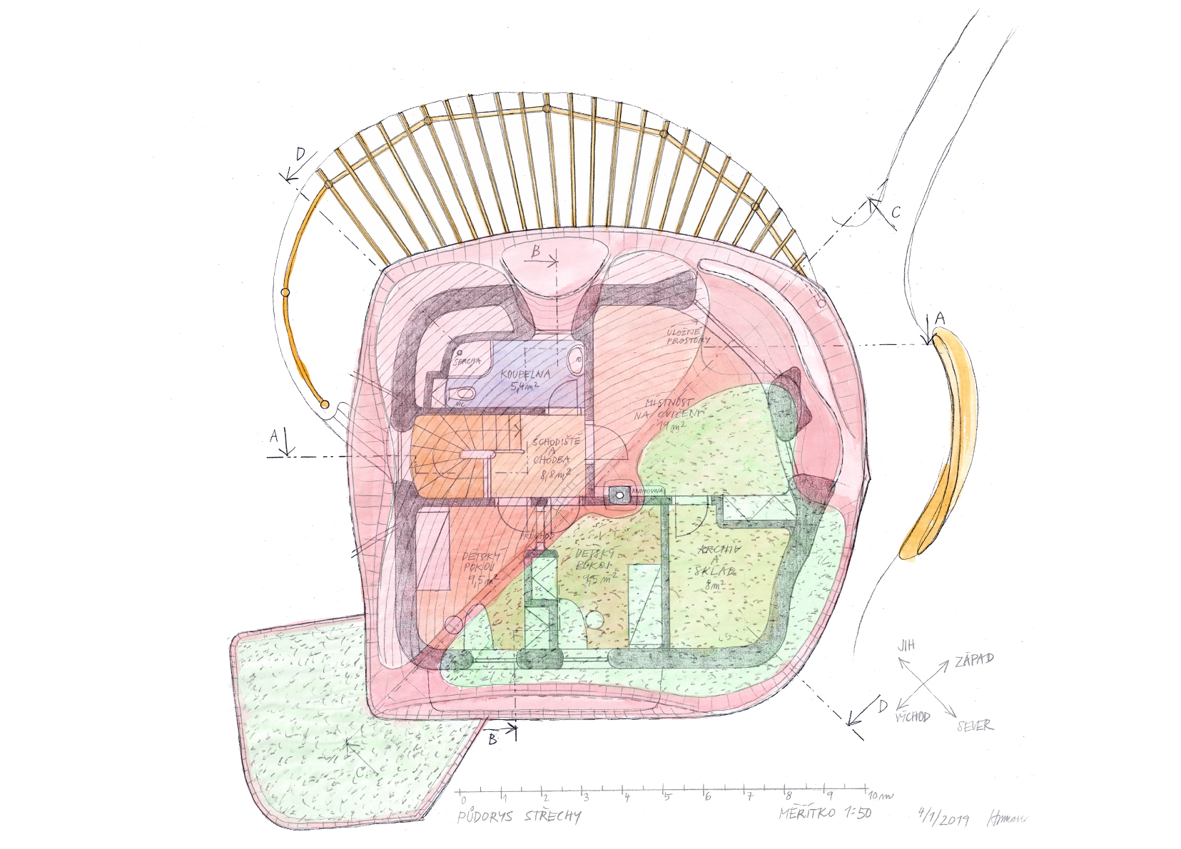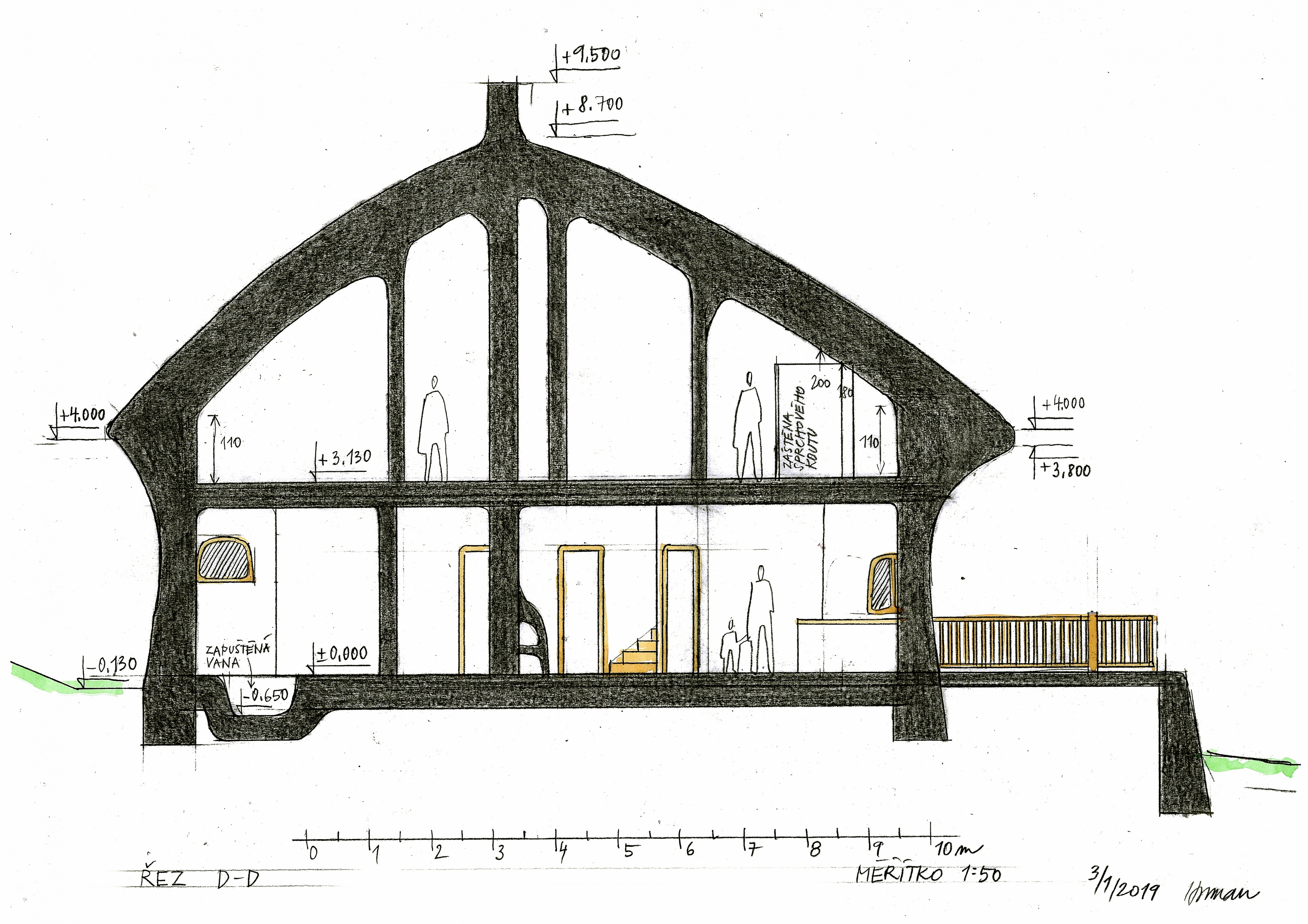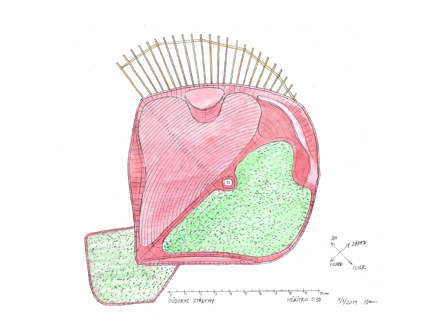 Projekt organicky tvarovaného nízkoenergetického rodinného domu ze zdravých přírodních materiálů. Obvodové stěny jsou zděné z tepelněizolačních cihel. Krov a stěny v 1. patře jsou celodřevěné (hrázděné). Půdorys domu je 9,5 x 9,5m. Dům má dřevěnou trámovou konstrukci stropů a podlah, vnitřních příček a střechy. Přirozené geomagnetické pole Země tak může zdravě prostupovat domem. Krov je zateplen 34 cm silnou izolací z přírodních materiálů. (slisovené slámy nebo z měkké dřevovláknité vlny). Stěny jsou prodyšné, difuzně otevřené. Veškeré vnitřní omítky jsou hliněné. Dům je přitápěn krbem na dřevo. Koncepce stavby obsahuje principy feng shui a sakrální geometrie.