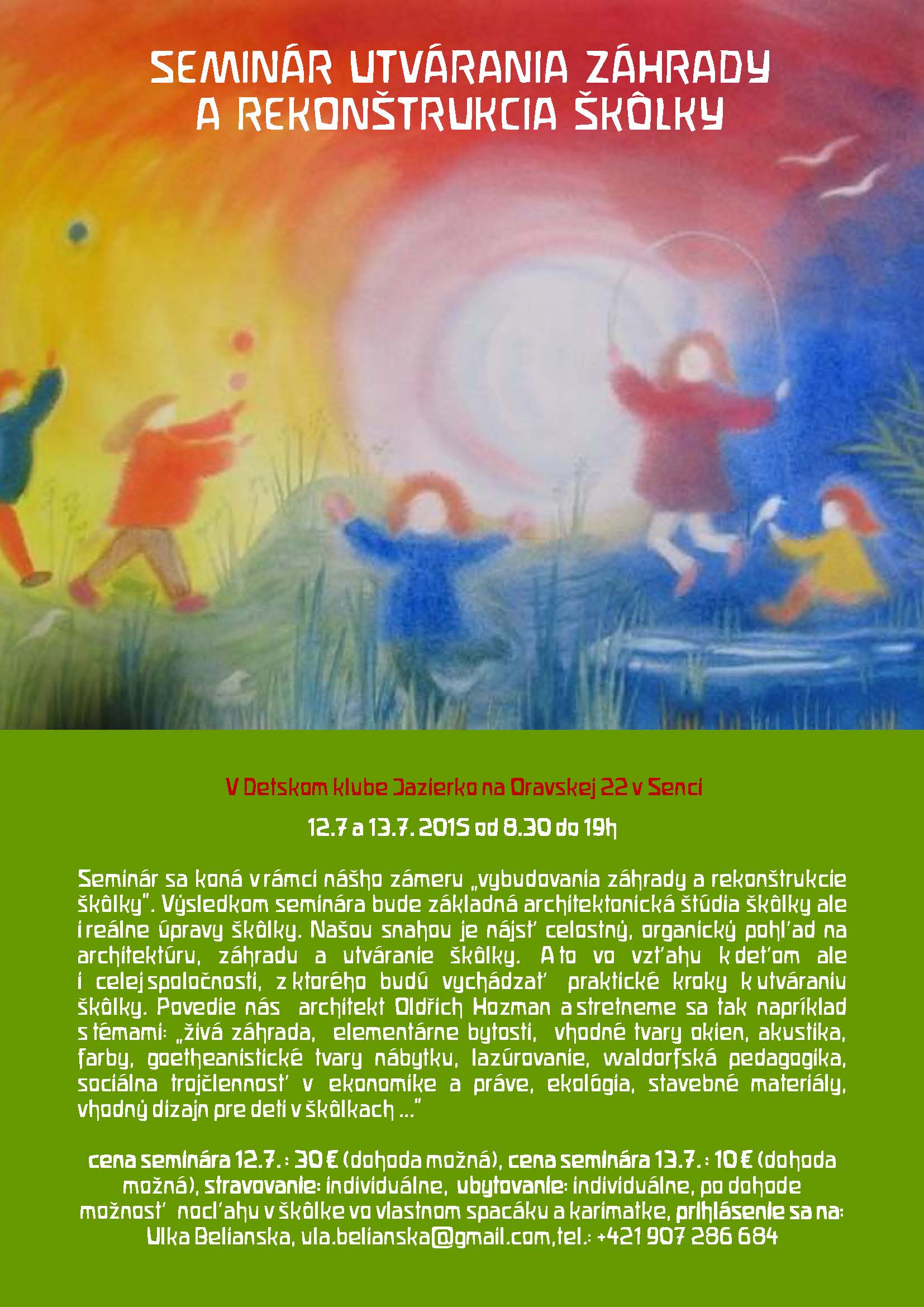 Seminár sa koná v rámci zámeru „vybudovania záhrady a rekonštrukcie škôlky“. Výsledkom seminára bude základná architektonická štúdia škôlky ale i reálne úpravy škôlky. Našou snahou je nájsťcelostný, organický pohl‘ad na architektúru, záhradu a utváranie škôlky. A to vo vzt’ahu k det‘om ale i celej spoločnosti, z ktorého budú vychádzat‘ť praktické kroky k utváraniu škôlky. Povedie nás architekt Oldřich Hozman a stretneme sa tak napríklad s témami: „živá záhrada, elementárne bytosti, vhodné tvary okien, akustika, farby, goetheanistické tvary nábytku, lazúrovanie, waldorfská pedagogika, sociálna trojčlennost‘ v ekonomike a práve, ekológia, stavebné materiály, vhodný dizajn pre deti v škôlkach …“